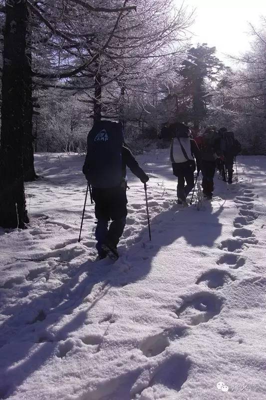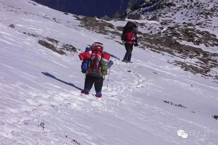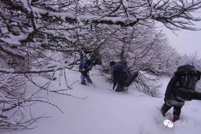 前二天的路很好走,除了因高反和体力原因下撤了几个队员,其他人都很顺利。第三天开始,冬季鳌太的狰狞面目开始显现。寒冷、大风、大雪、大雾、深雪、亮冰,巨大的石堆与杂碎的乱石相间,冰冻陡坡开始出现,需要不停地攀爬、跳跃、上升、下降、侧切,并且危险地段频频出现。一眼望不到边的乱石需要攀爬,长时间在将近70度陡峭的斜坡上侧切。沿途无任何现成山径,基本沿着前队走过的脚印前进,但前队走过的脚印窝,往往很滑,需要手脚并用,小心翼翼地用手杖支撑缓慢通过。