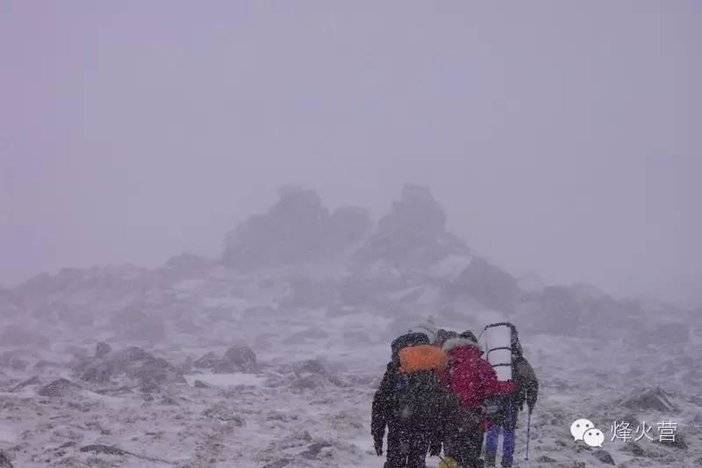 历尽悲喜,在艰苦中熬到第六天,这是全程中最漫长的一天,大家在大雾和风雪中整整挣扎了8个多小时。晨起,原本晴朗的天空开始慢慢变天了,天渐渐地由阴转变成大雾弥漫,前一天看起来不怎么扎眼的石海,又开始变得面目可憎。不知不觉中,大风又卷杂着雪粒扑面而来,拍打在大家浮肿的脸上格外的痛。