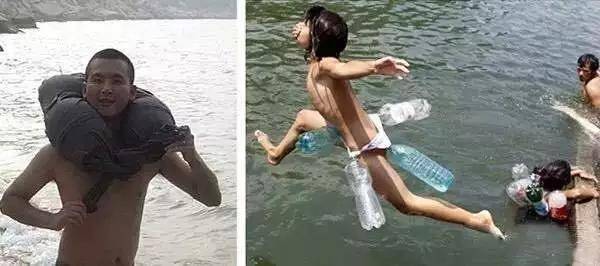 吹起几个,放入一个长裤中,扎紧裤腰和裤腿,然后你抱着“她”,可以渡河。