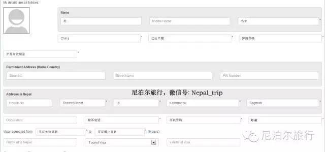 按照叶凉示范好的填写,没有星号的可以不填。尼泊尔当地地址采用的是加德满都宾馆,您可以自行更改为自己预定酒店地址,或者按照我完成的范例依葫芦画瓢照样填写即可。注意要点击左上角人像上传标准照片,照片格式太大的话会无法上传。