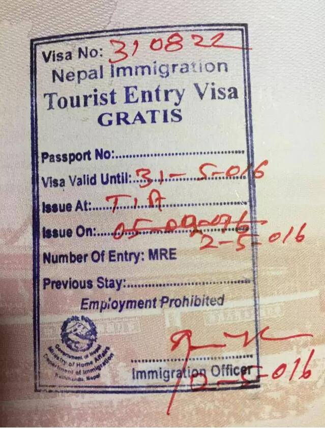 游客抵达落地之后,可以一次最多办理三个月的免费签证(有时根据政策只给30天的签证,可自行前往移民局续签)。入境免费签证上面有GRATIS的字母,以示不付费之意。油印的签证章有多种版本,都可以正常使用。机场办理的落地签都是多次签证,也就是说可以在签证期内多次进入尼泊尔,而移民局办理的签证分单次和多次。