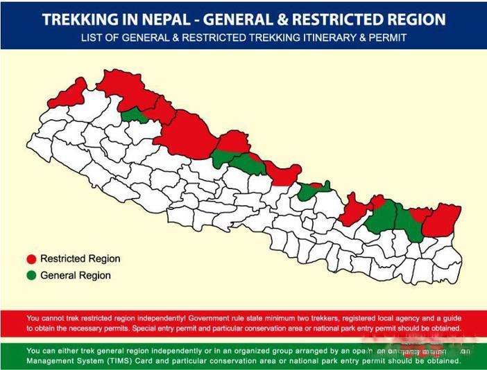 以下是列出了尼泊尔的限制性徒步旅行区(红色)和非限制徒步旅行区(绿色)的信息图表。