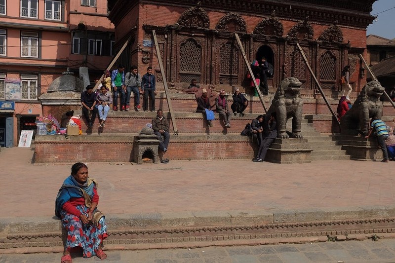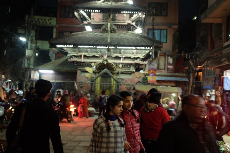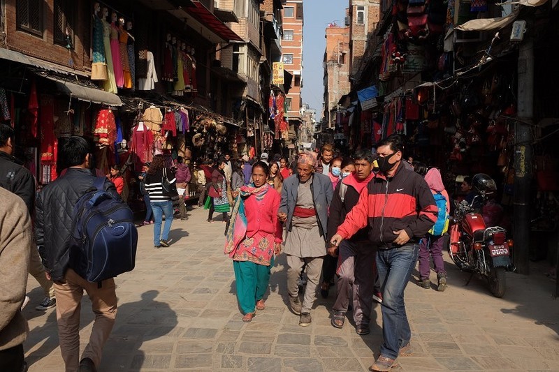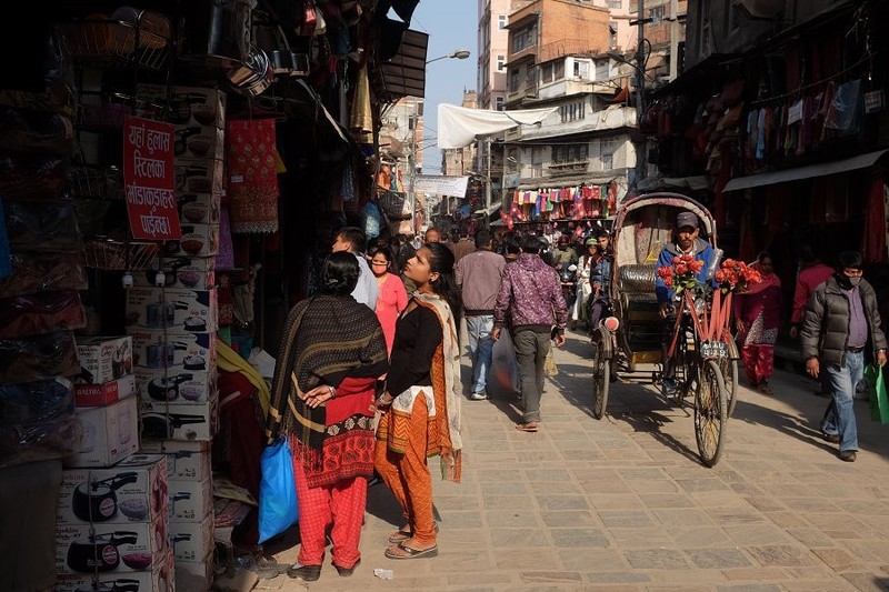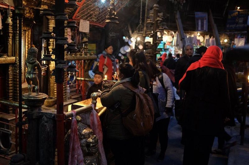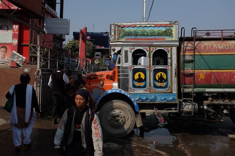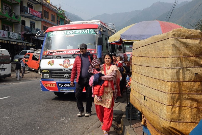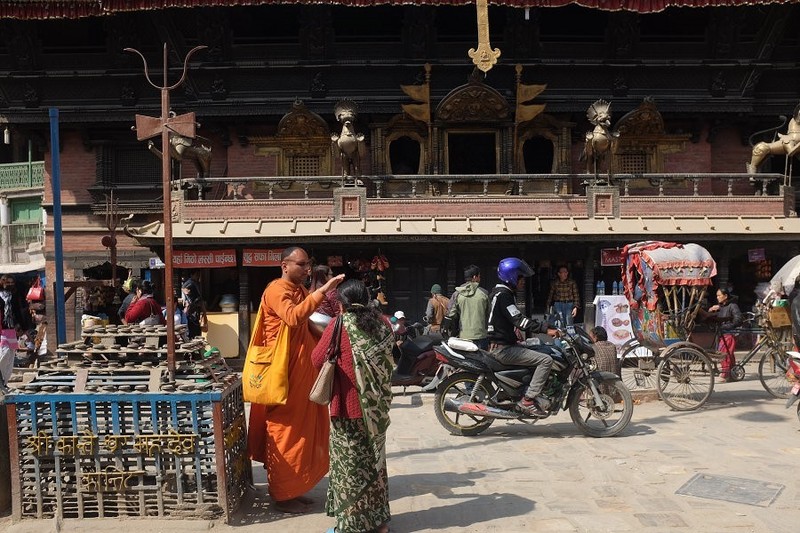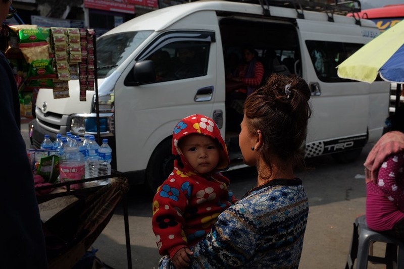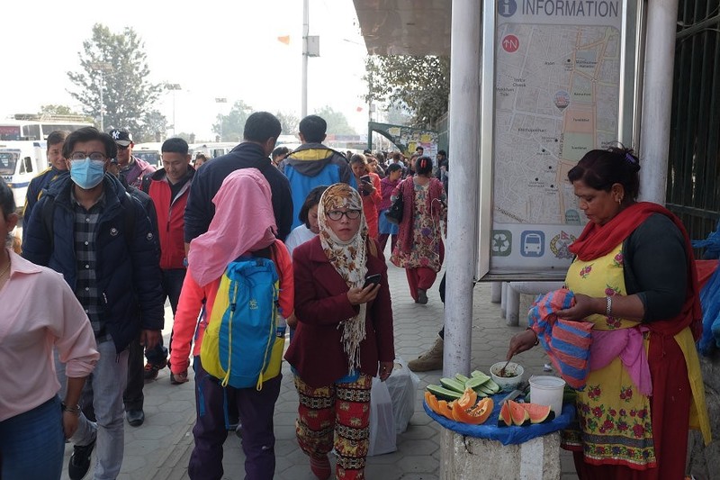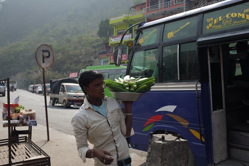 路过一处热闹场所,人车聚集,很多中巴车都在这里上下乘客,车门在行走中也敞开着,售票员站在门旁招睐着客人,小贩头顶盛着黄瓜水果的托盘追着车叫卖。穿着鲜艳的尼泊尔人来来往往。司机说附近有一座神庙,这里每天都热闹非凡,经常堵车。
