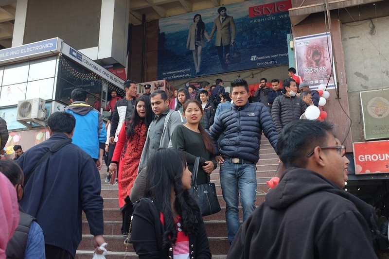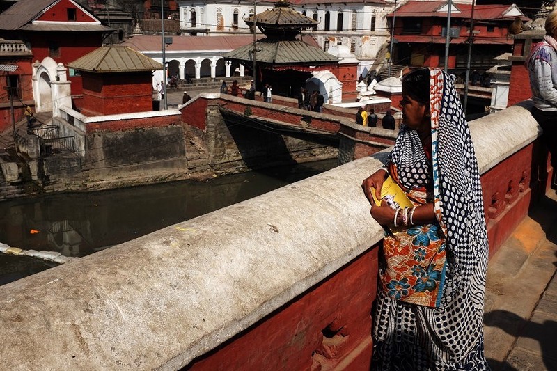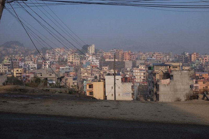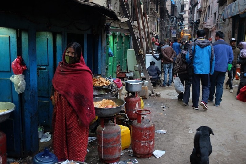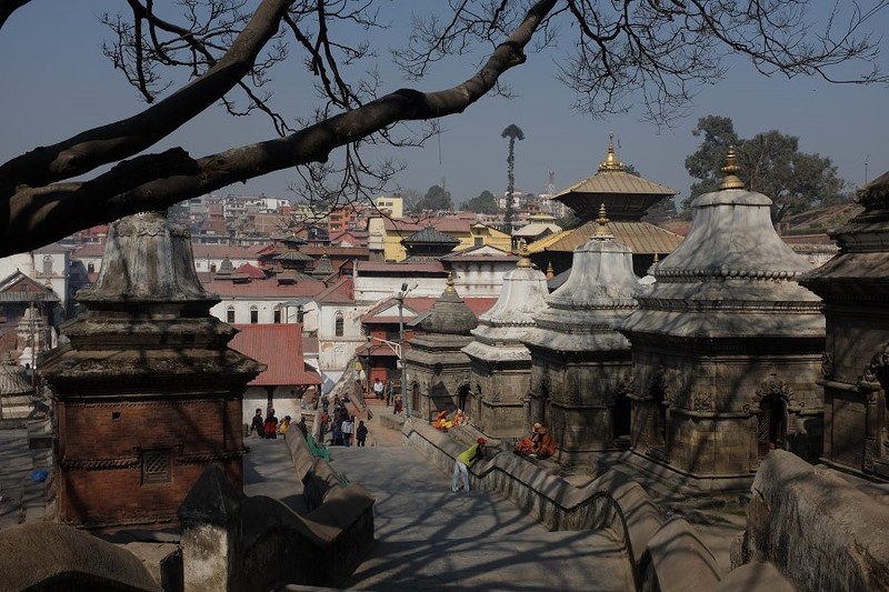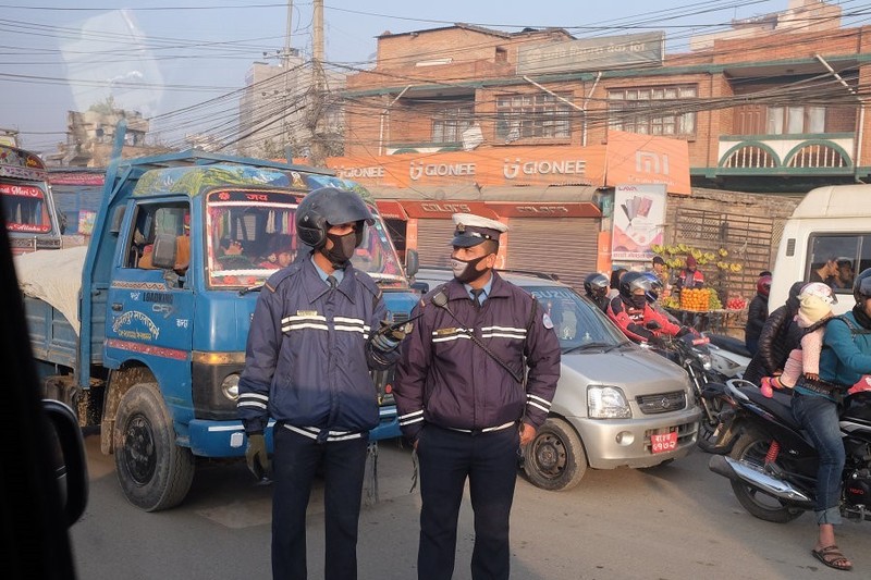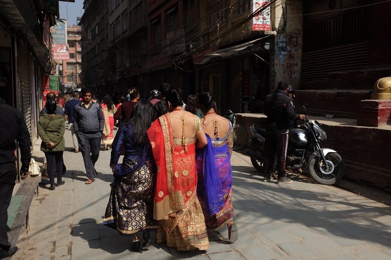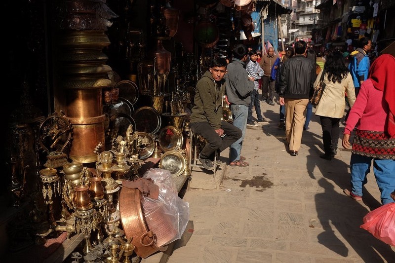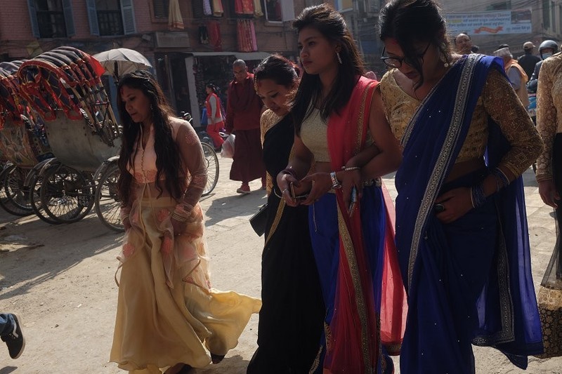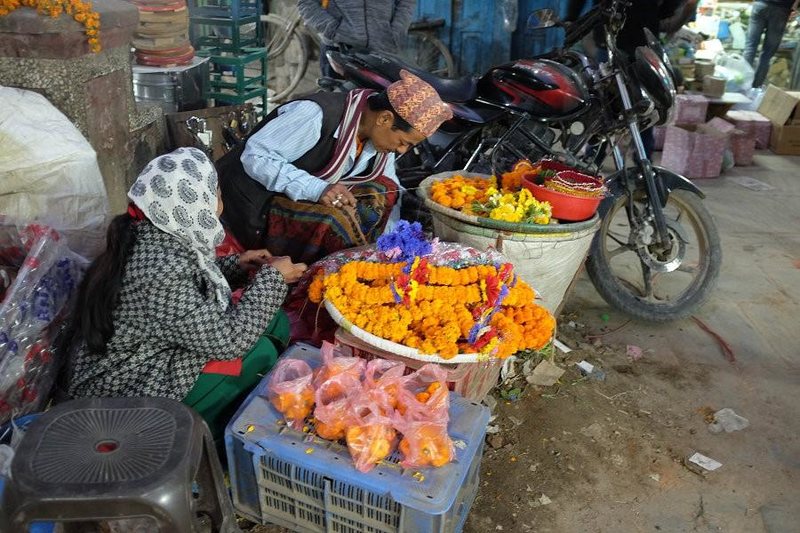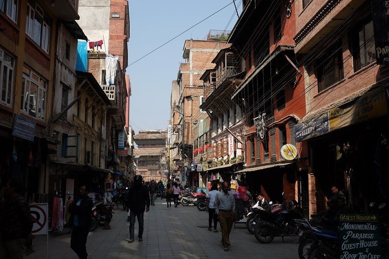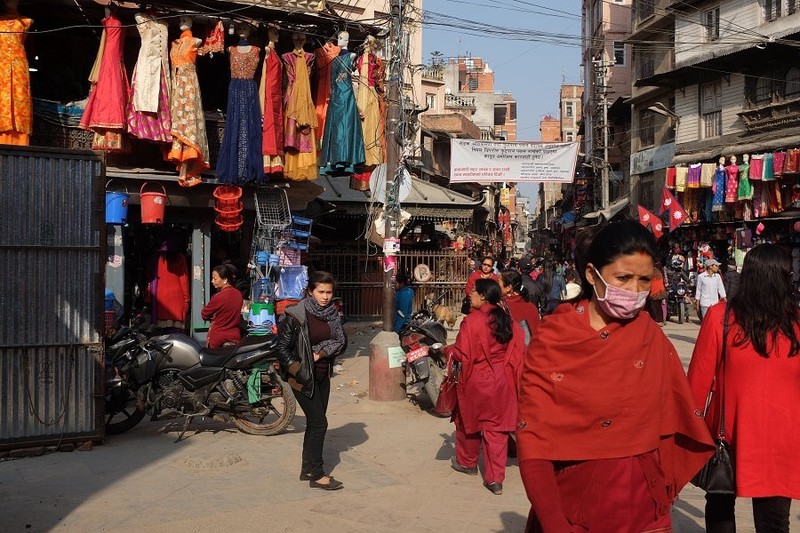 路过一处热闹场所,人车聚集,很多中巴车都在这里上下乘客,车门在行走中也敞开着,售票员站在门旁招睐着客人,小贩头顶盛着黄瓜水果的托盘追着车叫卖。穿着鲜艳的尼泊尔人来来往往。司机说附近有一座神庙,这里每天都热闹非凡,经常堵车。