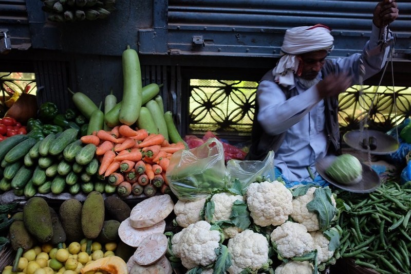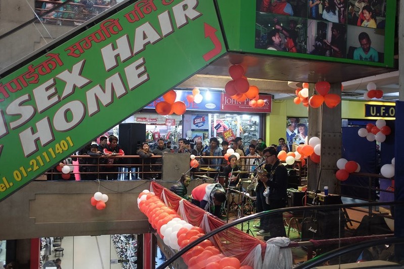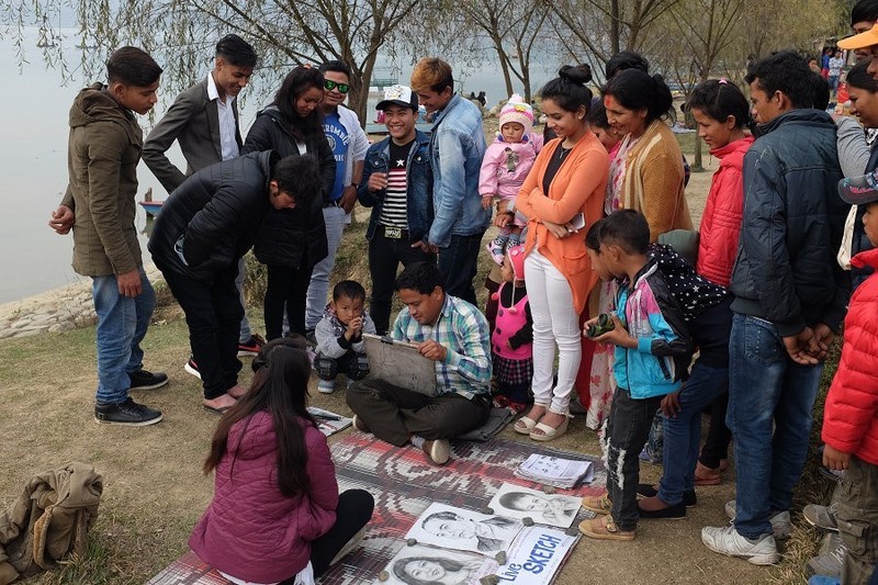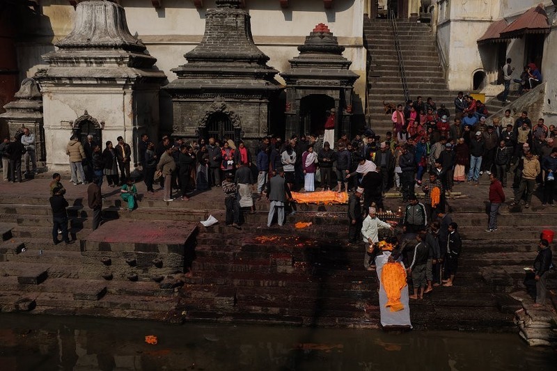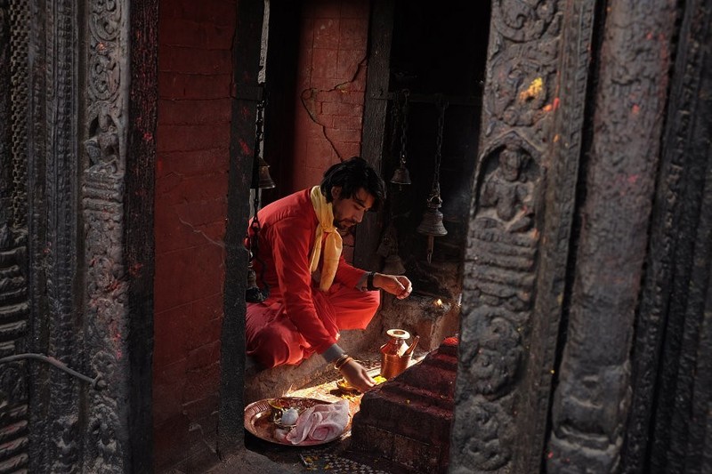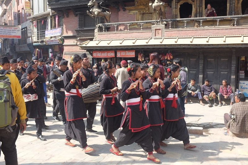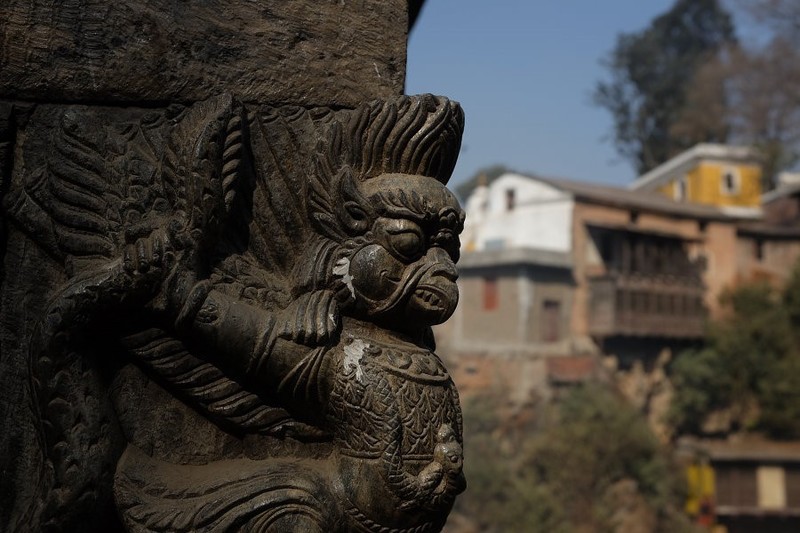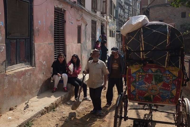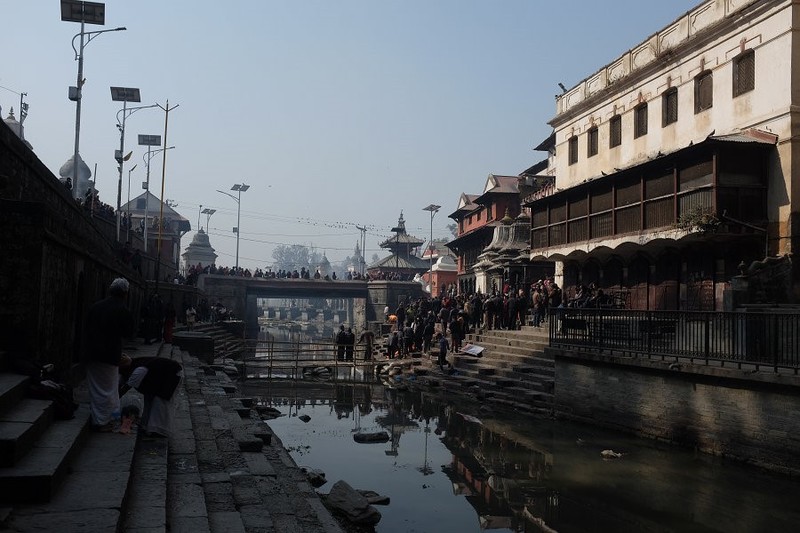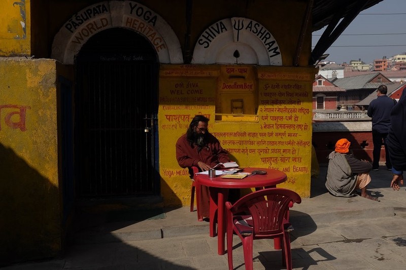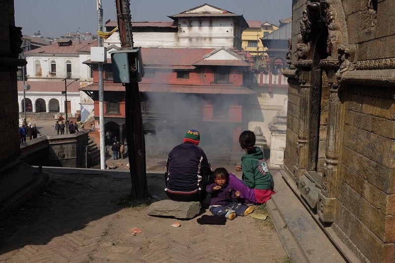 路过一处热闹场所,人车聚集,很多中巴车都在这里上下乘客,车门在行走中也敞开着,售票员站在门旁招睐着客人,小贩头顶盛着黄瓜水果的托盘追着车叫卖。穿着鲜艳的尼泊尔人来来往往。司机说附近有一座神庙,这里每天都热闹非凡,经常堵车。