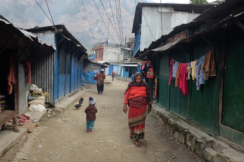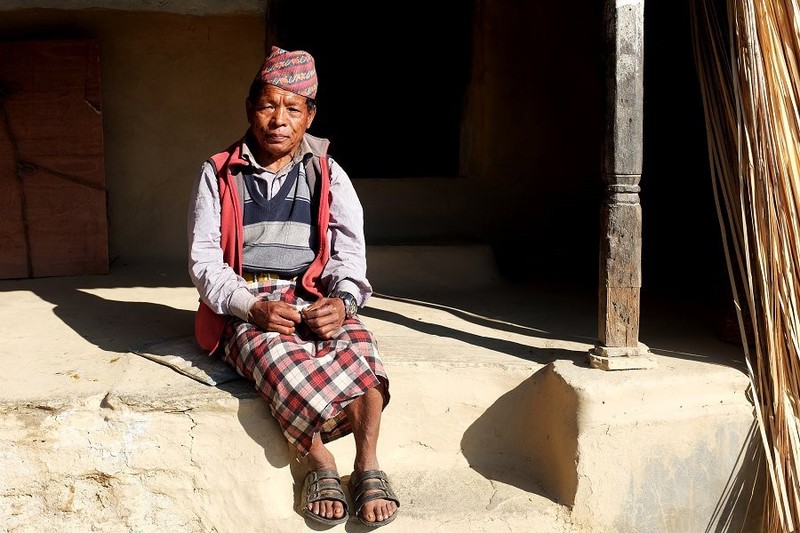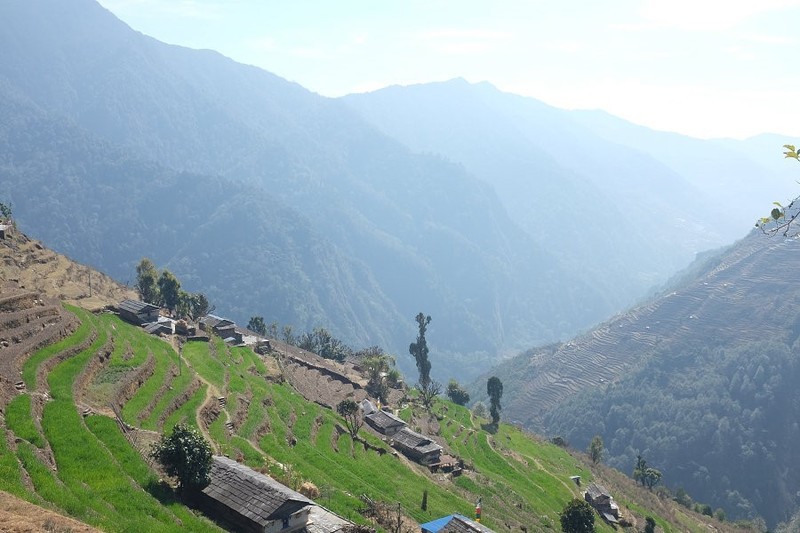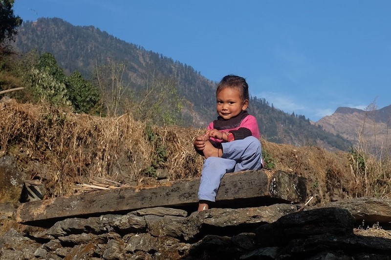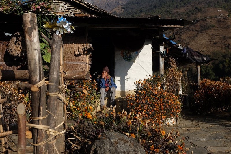 开始就是一个陡坡,一直下到沟底,过桥又开始急促上升。太阳热辣辣地暴晒着,路上干裂得扬起了尘土。走了不远,身上的汗水都已流尽。这一段的村子比较多,不时从农舍前穿过,也不断双掌合一,互致“namaste”。这是尼泊尔的问候语,也有祝福的意思,有些类似藏语的“扎西德勒”,这句话一直伴随在徒步路上。一位尼泊尔老农坐在自家门前的台阶上端着盘子吃抓饭,石块砌就的地坝上用晒垫晒着粮食,妻子在塑料水管前洗着器皿,一条大黑狗懒洋洋的眯着眼卧在女主人跟前,蹒跚学步的小男孩追赶着几只母鸡。屋下面就是青绿的梯田,一棵茂密的大树佇立在梯田中间。此情此景,田园牧歌之类的词在脑子里迸发。Stone与xing哥比划着与老农搭话,并分食了他的玉米抓饭。我问他们好吃吗? Stone说你自已去尝尝就知道了。