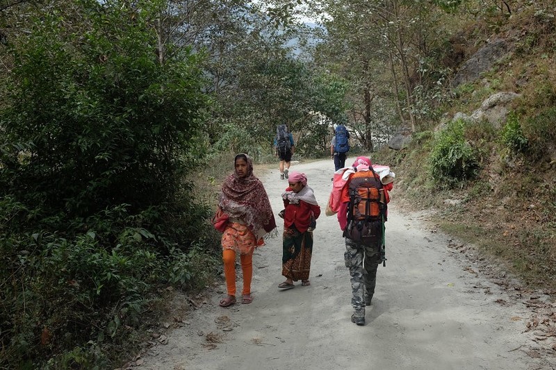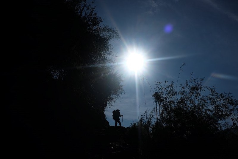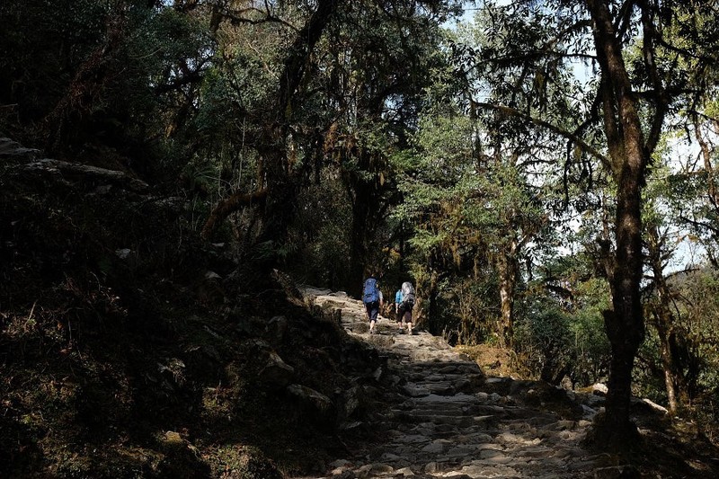 午餐后开始了连续的上升下降。路上还看见了猴群,尼泊尔的猴子是灰色的,头部围着一圈很深的白毛,脸庞却是黝黑的,和家乡的猕猴完全不同。猴群看见人便呼啸着窜进山林里去了,剩了两只在树梢上探头探脑。