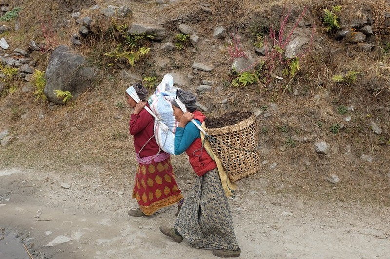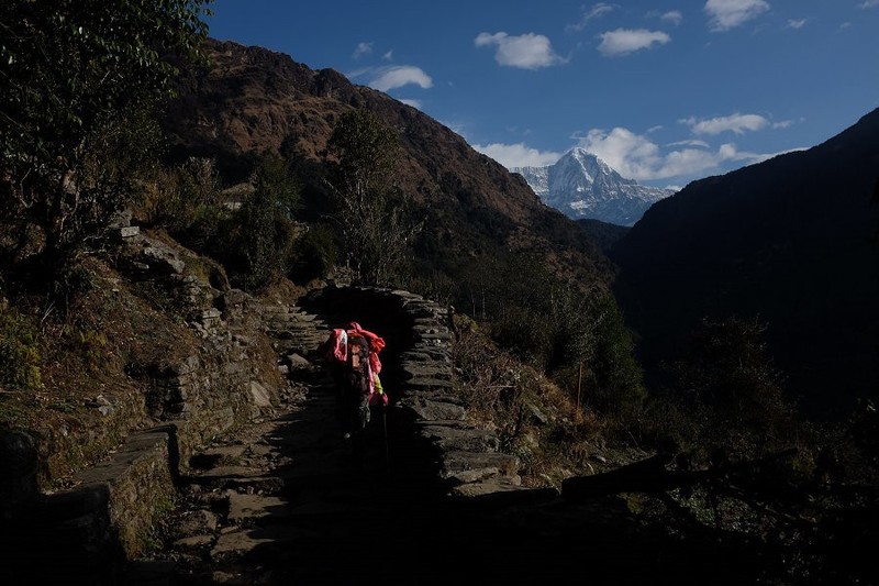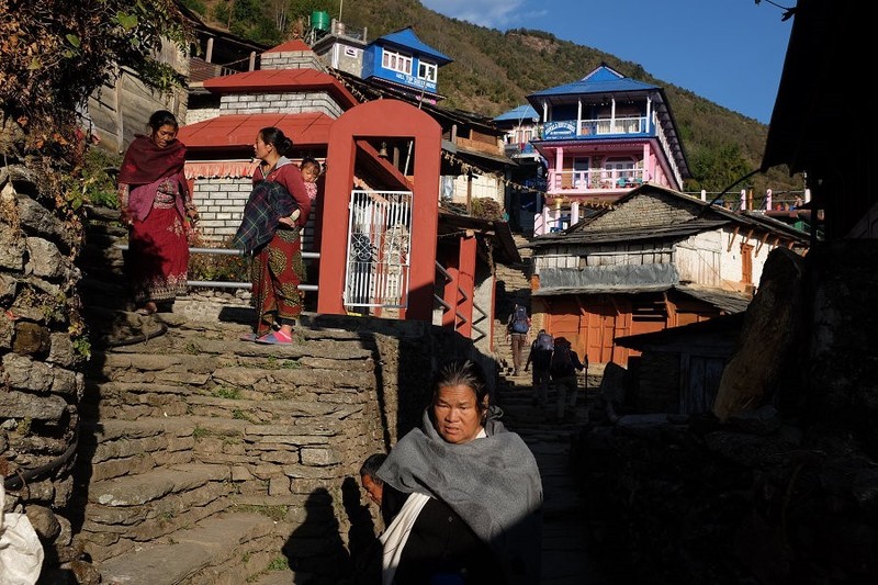 南桠浦(Nayapul)是公路旁的一个小村子,只有几幢低矮小屋,但却热闹非凡。这里是徒步起点,各种肤色的徒步者和背夫向导在这里聚集,东歪西倒的扔着大大小小的登山包。坐在木椅上喝了杯咖啡后开始徒步,心情轻松、意气风发。同一条路上,行色匆匆的徒步者和悠闲泰然的当地人对比鲜明。走了不远,经过ACPC 与TIMS的两道查验处便正式进入了安娜普尔纳保护区。从查验处爬石梯进入一个村子,村口设有给学校捐款的募捐箱,xing哥代表我们大家捐了尼币。路上的大多数学校门口都有捐款箱,这也是尼泊尔的希望工程罢。过了村子,又走上了公路。沿途都有一些给徒步者提供食宿的休息点,小楼油漆得漂漂亮亮,木栅栏爬满了艳丽的鲜花。路边的田野里有农夫在辛苦劳作,不时遇见背农家肥的尼泊尔妇女,她们用一条背带勒在额头上,背筐的重量全在这根背带上。一些背夫也用这种方法背运行李。