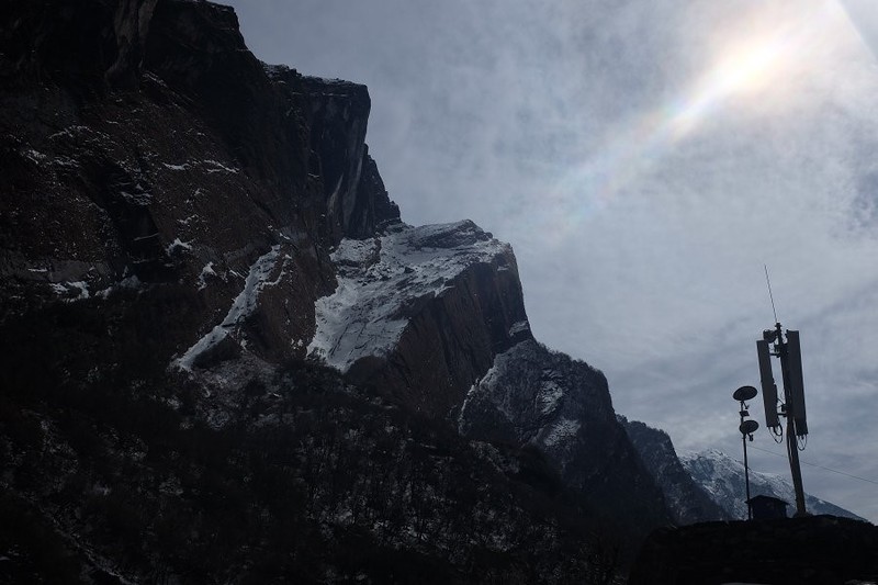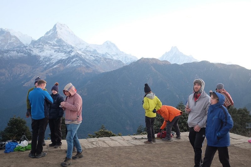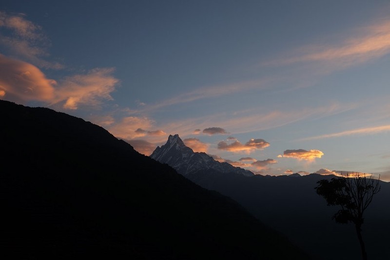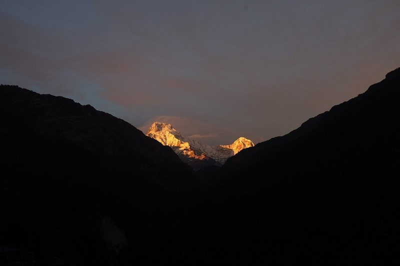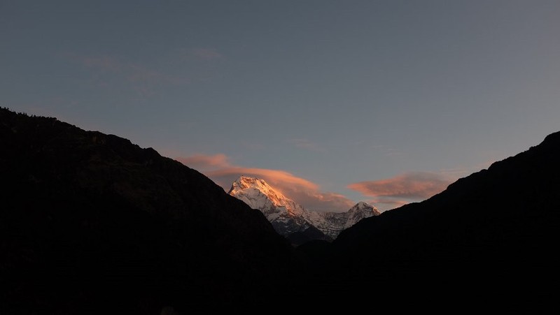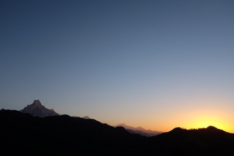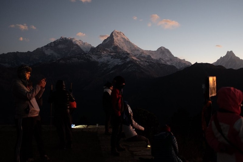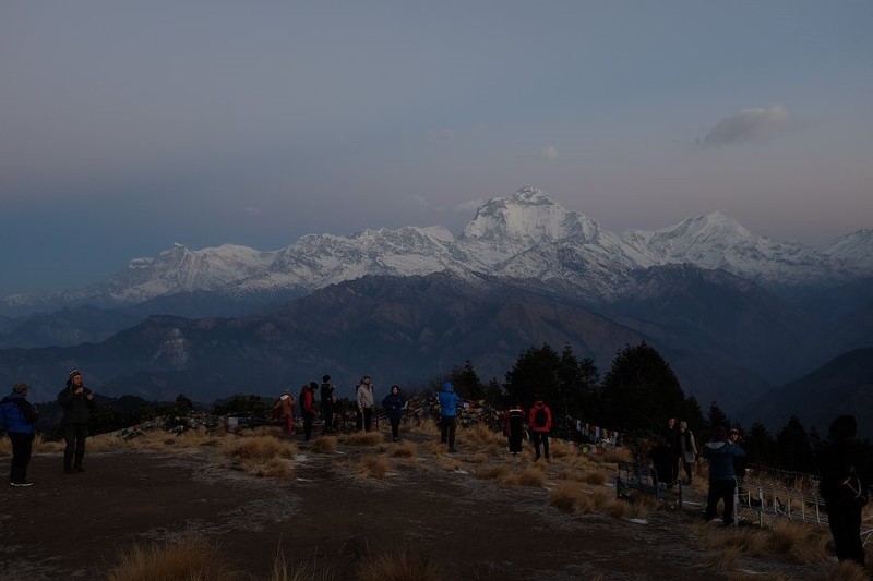 第二天四点半就起床,穿好羽绒服,戴上头灯,开始了往Poon hill(布恩山)观景台的爬山。从住地到观景台有近400米的高差,路上越来越多的头灯和星空一样璀璨,煞是壮观。为赶日出,几乎没休息,一鼓作气的登上了观景台。我暗自窃喜,看来体力已恢复大半。观景台海拨3200米,平台上放着几张长椅,中间有个铁架眺望台,周围挂着些五颜六色的玛尼旗。各色徒步者兴高彩烈的摆出各种姿势拍照留影,等待着日出。东方的天边抹起了一缕桔红,在蓝灰色的天空和黑黝黝的云海之间,太阳快出来了。在小棚里买杯奶茶,捧着坐在长椅上,看着雪峰慢慢变色。人们激动着,我却有点不为所动,不知这些年的雪山日出看多了,有点审美疲劳,还是激情已慢慢褪去。