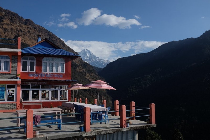 中午走到了Chhomrong,这是徒步路上最大的村子,条件也很好,很多老外到这里就憩下了,面对雪山,坐在躺椅上晒太阳。我们也在这里吃了顿正式的午餐----方便面加咖啡。几个中国人从ABC下来,说上面雪很大,要有冰爪才能通过。想到昨天走的雪路,我就不寒而栗。但我更加羡慕从上面下来的人,他们已经历经艰苦,轻松回程了,一脸的幸福感。我当时最大的愿望就是下撤到这里的时候,面对上去的人展现幸福感。