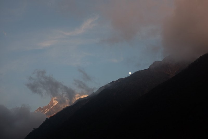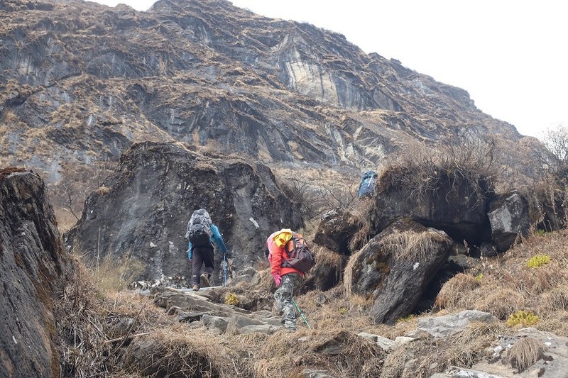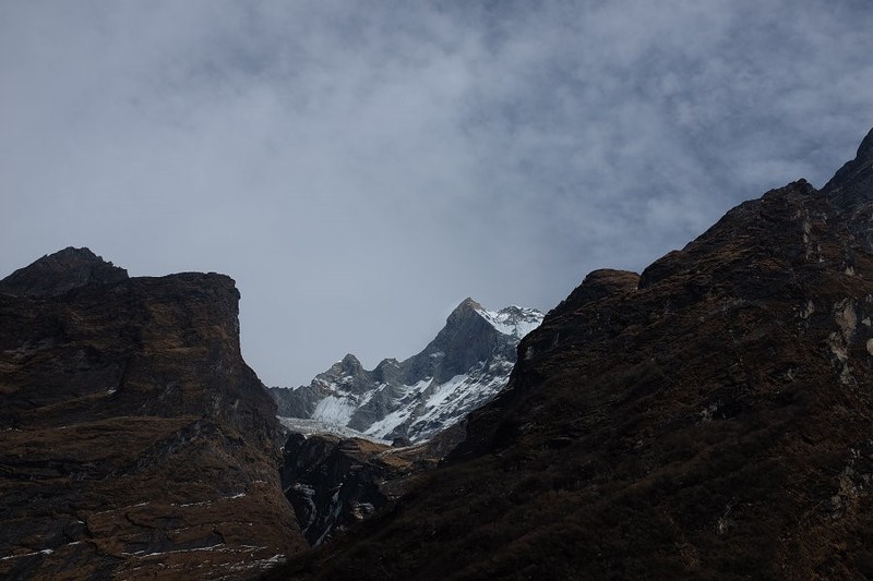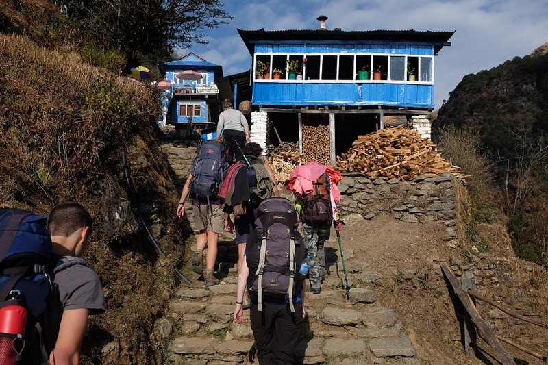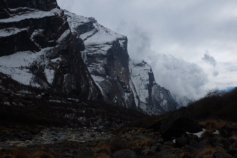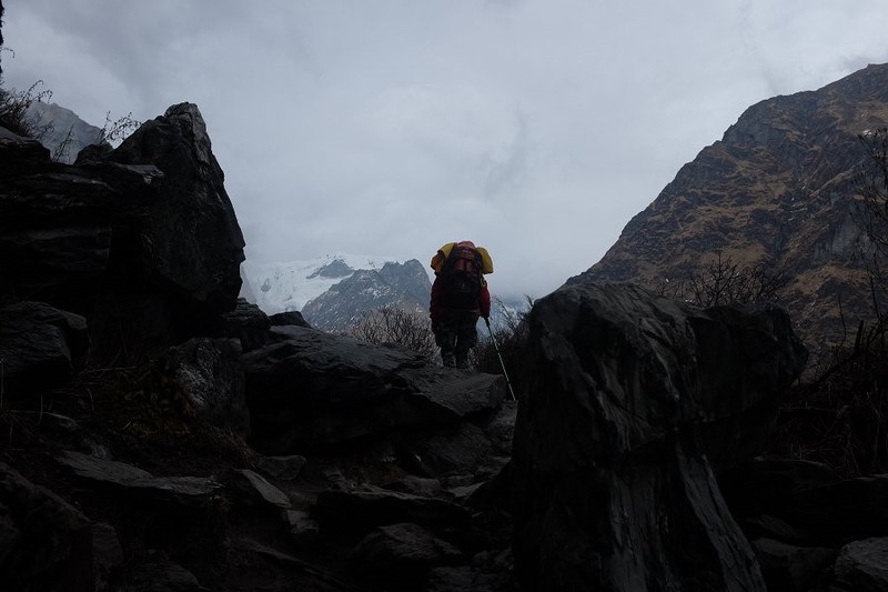 在我们的餐桌上就能清晰的望见对面山上Sinuwa的蓝色房屋,但却要下到谷底,再爬上对面山峰。顶着烈日,一步步地挪着,经历了暗无天日的下降、上升、再下降。小溪边出现了越来越多的竹林,天也暗了下来,Bamboo到了。可能烈日暴晒久了,有些中暑,头昏眼花,发着低烧,向飘要了两瓶霍香正气液喝下,睡了一觉第二天又精神了。从Bamboo开始,基本上都是上升了,没有了前几日的那种反复上下,但路也开始变坏了,很多地方被泥石流冲毁。景观变得荒凉,也没人家了。从冰川形成的河流在山谷里翻腾咆哮着。从Bamboo到MBC(鱼尾峰大本营)中途要经过Dovan、Himalaya、Deurali等几个宿营点。我们以前的节奏是每一个小时休息10分钟,现在变成了见宿营点才休息。在Himalaya,遇见一位新加坡姑娘,她的背夫是胖脸男孩,满脸堆笑,透着憨样,但眼睛里却闪烁着狡黠。他在教他的雇主玩一种纸牌,我们开玩笑的对新加坡姑娘说“当心他把你的钱赢光”。吃着煮土豆,想起了家乡的回锅肉,便大谈回锅肉各种做法。惹得新加坡姑娘含着口水呢喃道“…回锅肉”。原来她是湖南人,在新加坡读书后留下工作,提起有辣味的菜,眼里大放光彩。