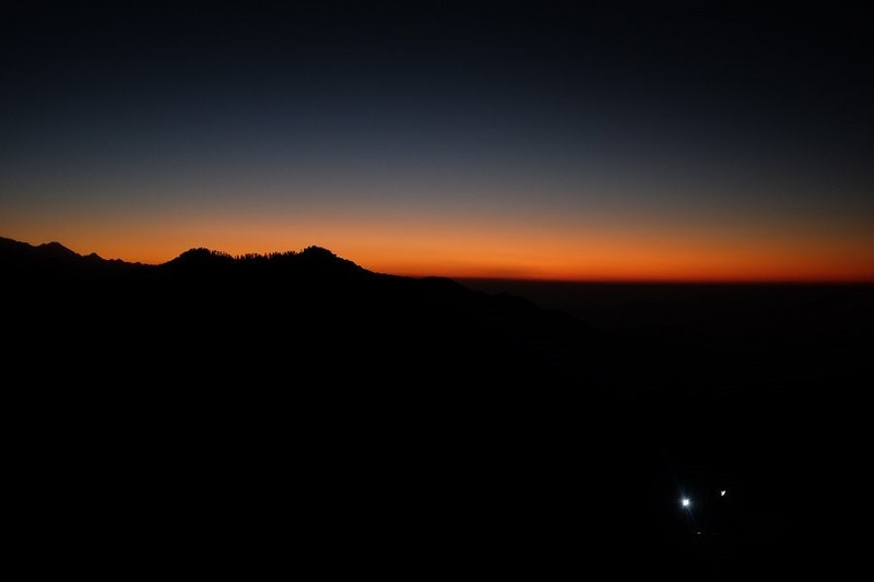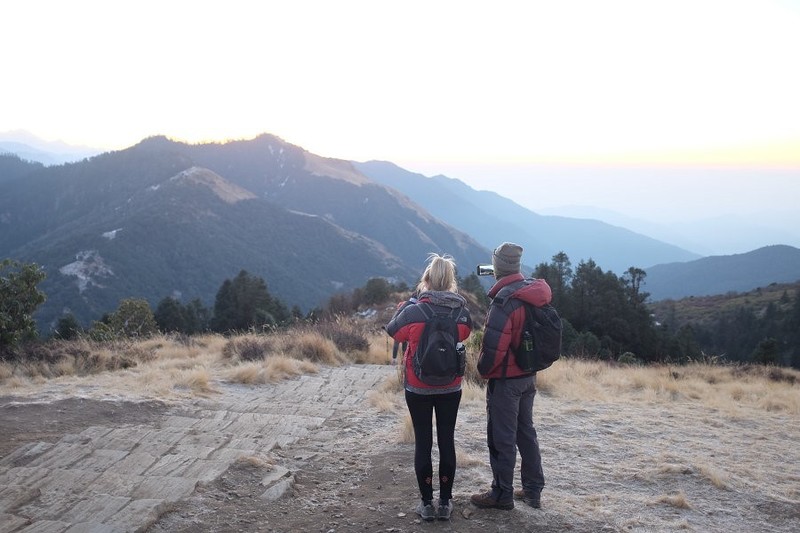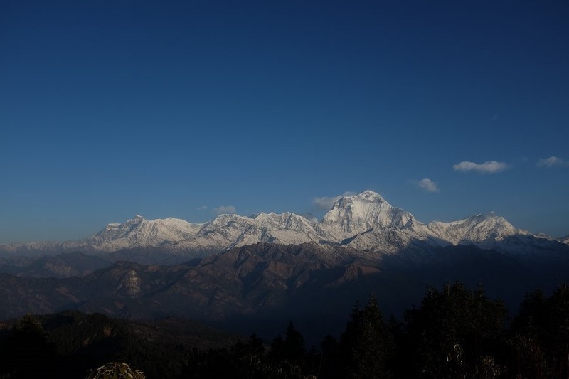 爬了一个长坡后来到Tadapani,这是一个山脊上的村庄,几个尼泊尔小伙在山坡的空地上打排球,我很担心他们的排球一不小心会滚落山涧。Tadapani条件不错,而且视野宽阔。已经快5点了,大多数人都在这里住下了。打听了路程,到Chuile还有1个多小时,为了节约明天的行程,还是决定走到Chuile。一路下坡,树林里寂静极了,只有风吹动树叶的声音和偶尔几声鸟鸣。天色暗了下来,身上有些发冷。加快步伐,几乎是小跑,在火烧云燃烧了半边天的时候,到达了Chuile。--------------------------------------------
