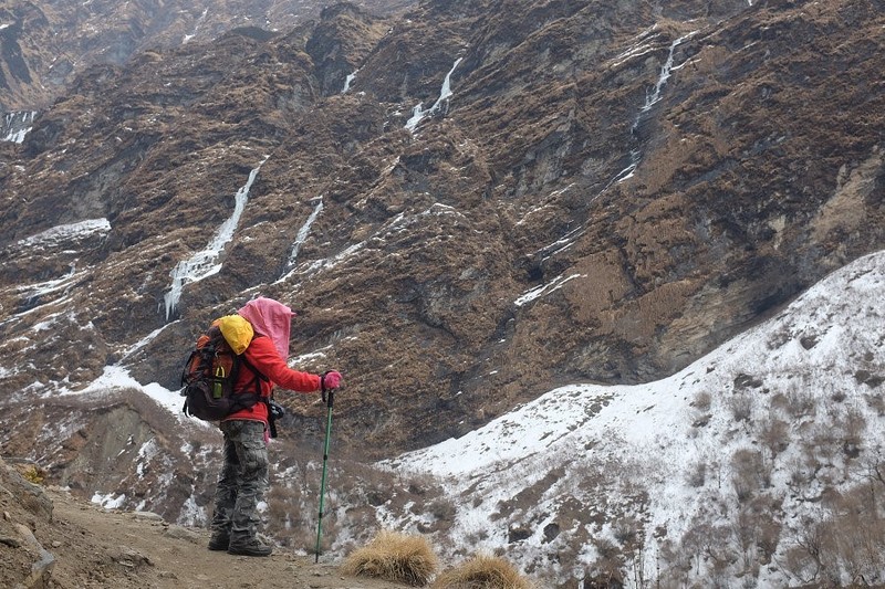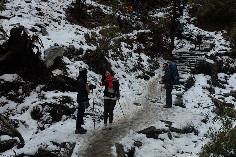 长长的下山路在树荫中穿行,积雪无阳光照射,不易融化,经人群踩踏,变得坚硬湿滑。在上面站立都不易,走路更是踉踉跄跄。我天生平衡有问题,逾加狼狈。最后无法行走,干脆坐在雪地上,双手支撑着往下挪,惹得同路的几个越南妹仔忍俊不住,纷纷站在旁边与我合影,我坐在雪地上,强挤笑脸,做剪刀手,以保持中国大叔那点可怜的尊严。飘却与一个帅哥向导谈得火热,帅哥向导告诉我们,以我们的状况,今天到Chhomrong是不可能的,天黑前走到Chuile也还得加快速度。
