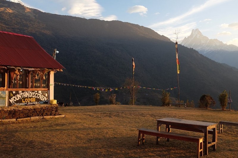 走完起起伏伏的土质公路,过了一座吊桥后,开始了在石梯路的陡直上升。上去就是今天的宿营地Ulleri,在地图上测得高度为500米,感觉没什么难度,但刚走几步就觉艰难。近来体力下降严重,再加春节腐败,这时彻底显现,气喘吁吁,走两步就无法迈腿,被远远甩在后面。许多人从身旁超过,甚至几名步履蹒跚的日本老太太都走在我前面,还不停的鼓励我加油。还好背着一个大包,不至于太丢脸。先还有节奏的走着,坚持走十分钟休息几十秒。后来走一步就要停三步,胡乱的喘着气,什么徒步法则全然不管了。不敢相信这是曾经梅里外转和穿越贡嘎的我。直到山边映出晚霞才神情恍惚的走到目的地。同伴已在客栈的院子里等着我。背包一扔,直接靠墙躺下,这辈子都不愿起来了。过了许久,将水壸里的果珍水喝完才慢慢回过神来。