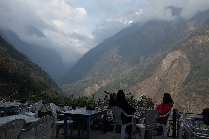 寻了间有宽大餐厅的客栈,放好行李后,就坐在窗前喝咖啡和茶。这里的高度有2800M,明显是高山气候了,窗外一会晴一会雨的,后来还飘起了雪花。气温骤降,在室内也穿上了冲锋衣外套。飘坐久了想要出去转转,我们喝着茶不愿动了,她只好独自拿着相机往布恩山走去。餐厅里安安静静的,中间烧着炉火。也没几个客人,显得有些冷清。我们整个下午就懒洋洋的喝着茉莉花茶,呆呆的望着窗外的雪花和匆匆而过的旅行者。飘回来后告诉我们,前面往上还有客栈群,正对安娜普尔纳诸峰,大多数游客都住在那里。
