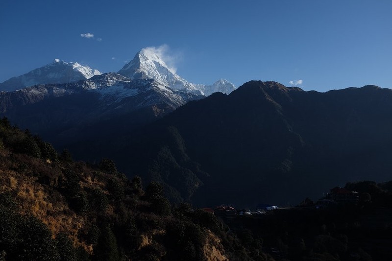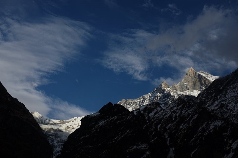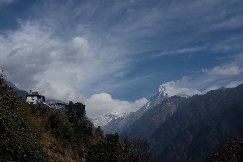 下山回到客栈吃了早饭,多煮了几个土豆权作午餐。我们这一路的午餐都特别简单,基本上都是煮土豆或鸡蛋对付一下,节约时间和经费。出村就开始了上山,正常按节奏走着,也很轻松。一阵陡上升后开始沿山脊行进,早晨的太阳和微风温暖清新,湛蓝背景下的安娜普尔纳山顶掀起了旗云。走到休息点,面对雪峰,俯瞰群山,心旷神怡。对照地图观察研究,决定改变原定在Chuile住宿的计划,直接走到Chhomrong。后来才知道这是一个自不量力的想法。