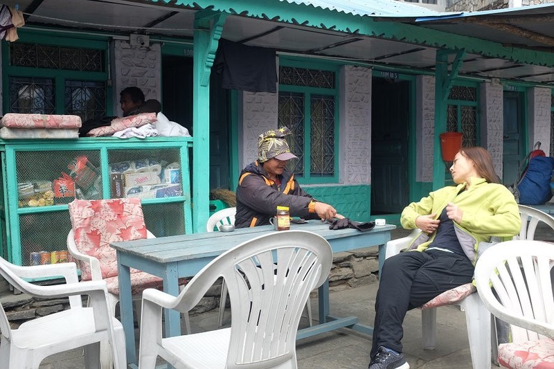 晚餐点菜时我们傻了眼,这里的菜单没照片,大家都看不太懂英文菜名,翻译软件加形体语言,终于点好了餐。其实,山上的尼餐也很简单,只有几大类,米饭类(cooked rice),抓饭、炒饭,面条类(noodles),意大利面、炒面,还有饺子,叫mo mo。我不喜欢菜里的奶酪味,要仔细看清菜名里有无cheese。有一种类似馅饼一样的食物,形状像饺子,只是大些,非常好吃,我们忘了菜名,每次点菜时都比划着说“greater mo mo”,服务员也能听懂。还有样非常重要的东西,就是开水(hotwater),山上的开水是要收费的,而且不便宜,每保温瓶200至400元尼币,越往上越贵。我们到住地总要几瓶泡茶、冲咖啡,灌水壸,这是笔不小的花费。