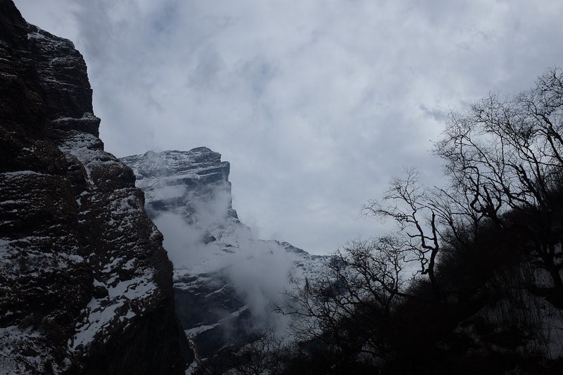过了Himalaya,是峡谷河滩上行走,山峰变得峻峭荒凉,植被越来越稀疏。临近MBC时,已在雪地上行走,雾也浓得看不清四周参照物。