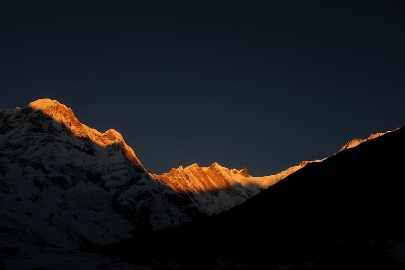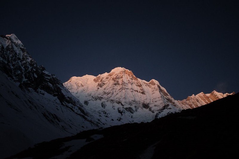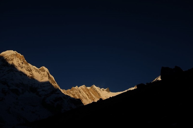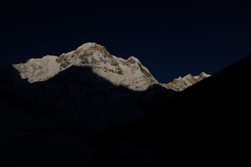第二天四点半,我们就起床,穿着羽绒服,戴上帽子手套太阳镜,带了头灯相机就摸黑向ABC(安娜普尔纳大本营)出发了, 路上铺着雪,但不太滑,根本不需要冰爪。虽然要从3700米上升至4130米,但坡很缓,根本不觉累,高反也没有了。厚厚的雪地上有一些动物脚印。Stone认为有狼的脚印,让大家走在一起。天已晴了,墨蓝的天空既深邃又透着清澈。四周静谧,风也停止了,只有登山鞋踏在雪上的声响,显得更加孤寂。快到ABC时,stone和我爬到旁边的高坎上,这上面的视野要宽广些。四周的山峰白雪皑皑,8091米的安娜普尔纳主峰横亘在眼前,坎边陡峭的崖壁直到冰川。雪山颠开始被染上金红色,迅速而沉稳地扩展。山顶上的雪被风裹协着,旋转上升,又消失在湛蓝中。雪山仿佛有了生命,威严、神圣又不乏柔情。世界变得纯净、透明,人世间的欲望、悲喜在那瞬间不复存在。