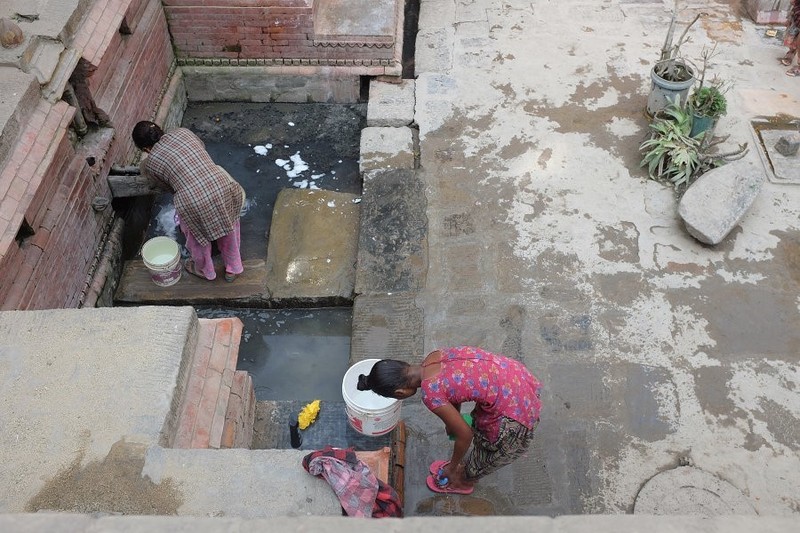 出酒店不远就有一家餐馆,二楼的平台上整整齐齐的排列着做工精致的木质桌椅,洁白的亚麻桌布,泛着金属光泽的刀叉,制服整洁端立着的的侍者,一切都透着舒适与档次。对尼餐完全不懂,看着英文菜单更无所适从,幸好菜单有照片。stone与达瓦商量了一下,帮我们点了菜。尼餐是每人一份,但我们点了一堆,放在一起吃。我英语很差,与达瓦无法交流,stone与达瓦用日语叙旧,也充当做翻译。达瓦是夏尔巴人,曾登上数座8000米以上的高山,珠峰上去过六次,而且是以登山协作的身份负重上去的。我们敬慕不已,举起啤酒频频与他cheers。第二天一早就起床收拾,在酒店餐厅吃完自助早餐。租的车已等在酒店外,与达瓦合影告别,就驶上了通往博卡拉的公路。尼泊尔的基础设施很落后,道路崎岖狭窄。乘座的吉普车是印度生产的塔塔,其质量与我们八、九十年代的国产车差不多,松松垮垮的。不过,司机的技术很好,超车、过弯的动作老练、娴熟。我这才放下心来观山望景。出了加都,车和人少了下来,空气也清新了许多。xing哥发现了一件新奇事,尼泊尔妇女洗澡居然就在路边的室外,她们拿件宽大的裙袍裹住身体,在水管边旁若无人的擦洗着,这也是一种风情吧。