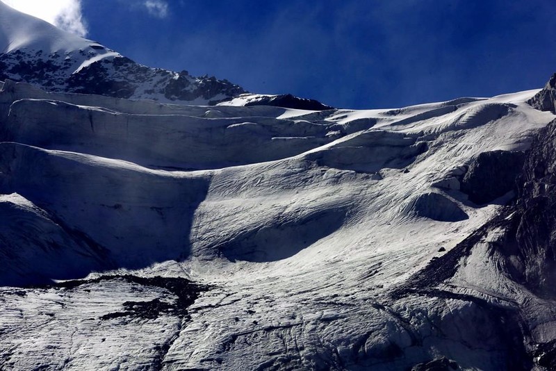 冰川走进后的路线坡度很大在60度左右,再向上有一段垂直攀登路线,两边岩壁状况不好,十分狭窄,且落石,看上去压迫感很强。我们贴着嘴边的岩壁往上走,但又不敢太接近,因为随时都会落石,向上攀登的过程中,冰川还是在不断地崩塌,夏天的天气太热了,气温变化很快,温差大,接近中午的时候,明显感觉冰雪融化的速度加快了很多,越来越不稳定,落石也越来越多。
