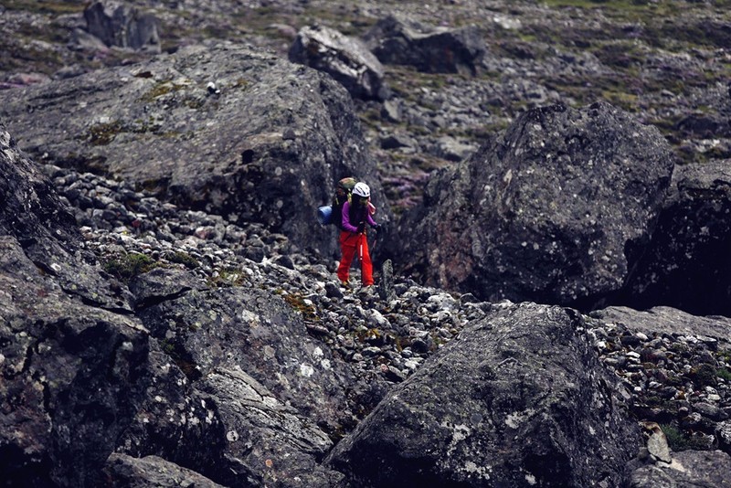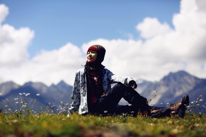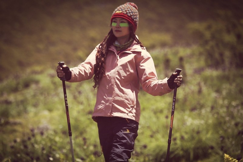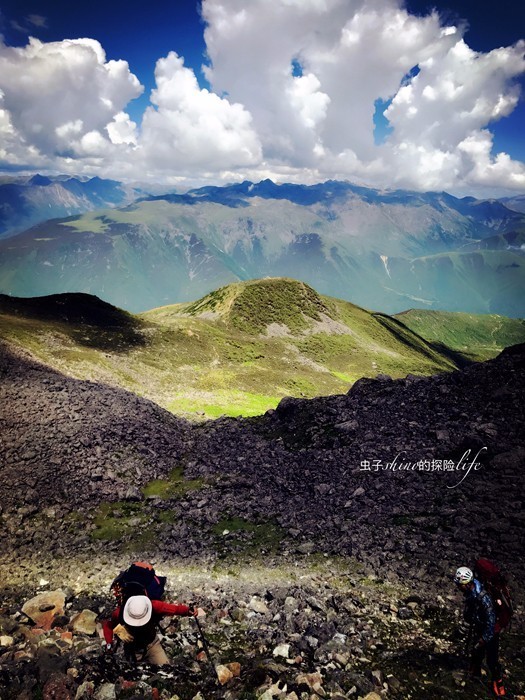 我们用了一个小时翻上了山梁,这段路十分难受,坡度在45-50度之间,全是碎石坡,偶尔可以看到牦牛踩过的路,但是也是断断续续的,一脚深一脚浅的翻上去,爬升的过程一直穿着抓绒配骆驼景甜款粉色冲锋衣,这件紫色抓绒的保暖性很好,颜色也很鲜艳抢镜,适合女孩子,还有白色小花的软壳衣简直大爱,防风保暖效果特别好,而且颜色清新自然,防水功能也很突出,结合了时尚的收腰款式,穿起来美美哒!~