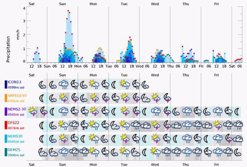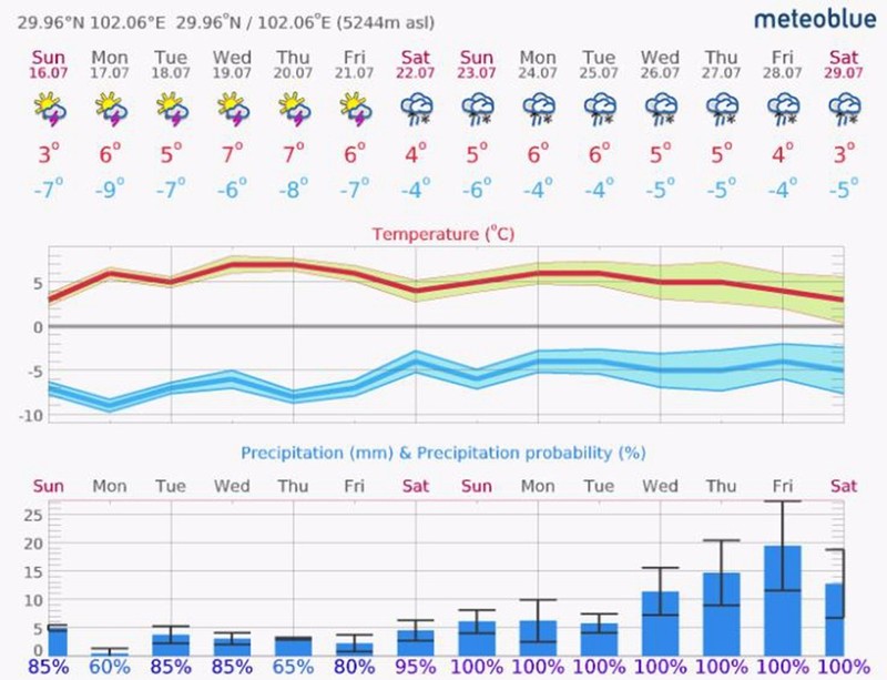 海拔拔升的太快,身体有了剧烈反应,夜里一直在想现在的身体条件,大姨妈加上高反,明天还怎么上,抬头望横梁,感觉真是崩溃,明天要负重所有装备,我不知道自己的体能能否撑的过去,4点,6点,睡的迷迷糊糊都醒了,睡袋很热,睡的很不舒服,夏季的贡嘎山区的气温真的是出乎意料的暖和,很安静的感觉,没有风。天气预报显示每天都会有降雨。心中默默祈祷后面的攀登顺利。