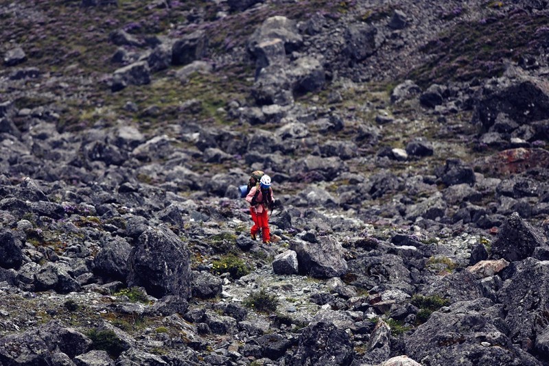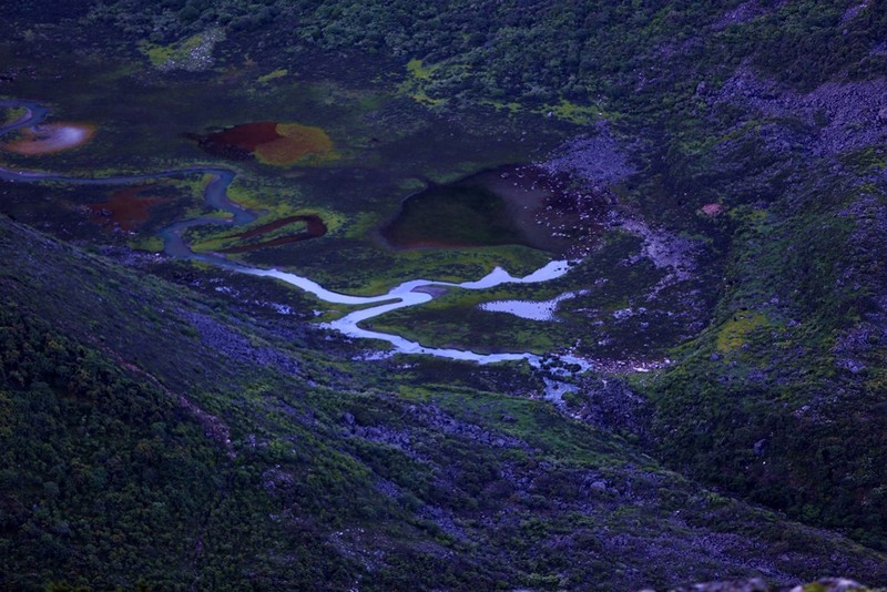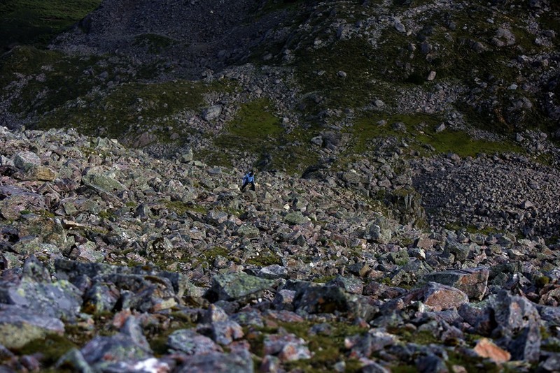 大致又过了一个半小时,小谭和顾铭也回来了,小谭说上去的石海路特别难走,爬到一半他的相机就无法再拿在手里了,因为需要手脚并用才可以继续攀爬,于是他把相机留在一块石头下,空身上去,没想到上山不容易,下山更难,差点滑坠,翻上去就是一个断崖,直壁仰角,不能够直接下到对面的沟里,遂放弃,退回到这里的路也是步步为营,艰难万分。