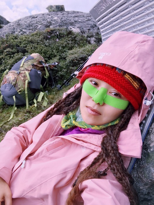 顾铭空身去探路,很久没有回来,一片云上来,下雨了,穿着骆驼的“景甜款”新款冲锋衣裤躺在这里,压根就不想动,真的很喜欢这款粉嫩颜色的冲锋衣,防水效果特别好,而且看起来很感情素雅的感觉。
