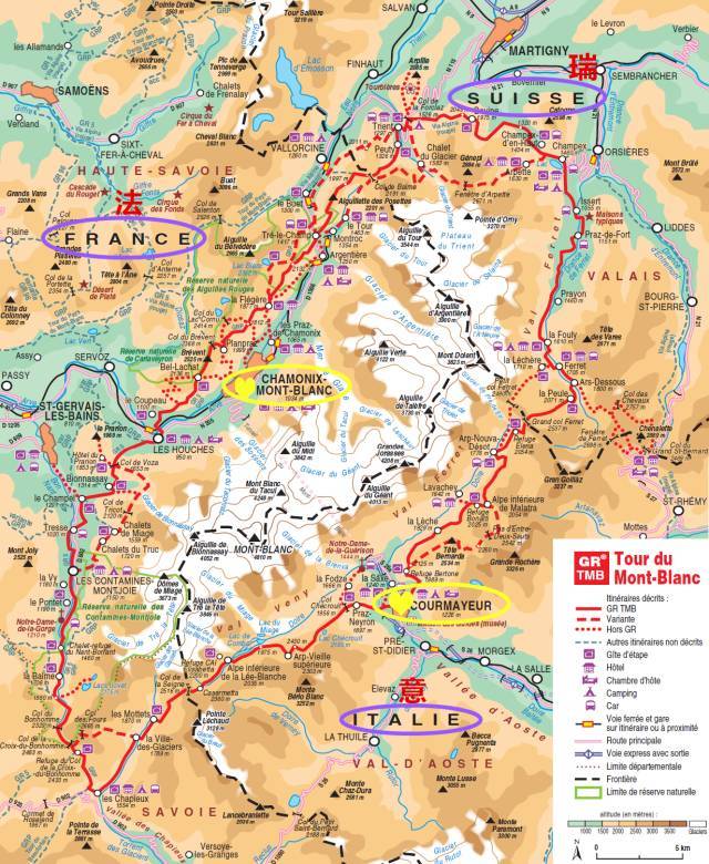 勃朗峰(Mont Blanc 法语:白色的山峰,后来才发现也是著名的品牌万宝龙)主峰高4810米,跨越法国、瑞士、意大利三国边境,环线全程170公里。相对于国内到处是六千以上的雪山,勃朗峰算是小弟。阿尔卑斯山脉虽然海拔不高,由于纬度高,永久冰川和常年积雪比比皆是。徒步爱好者在没有高原反应的困扰下,能欣赏到雪山冰川的美景和欧洲的高山徒步文化。