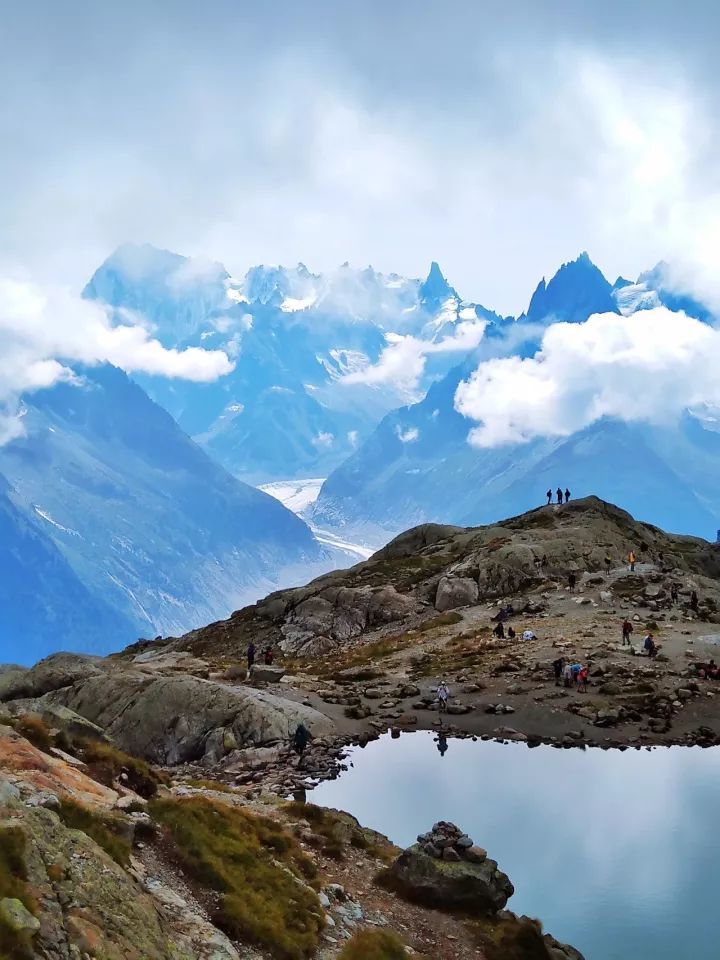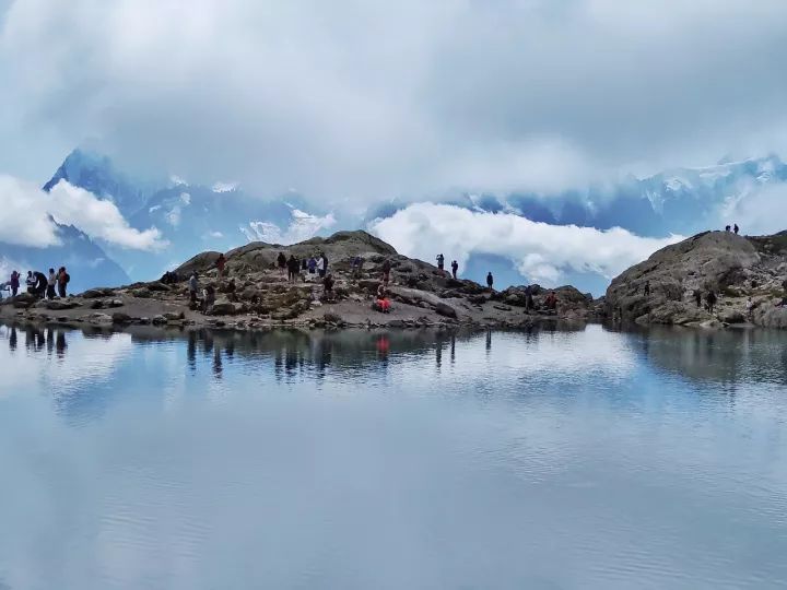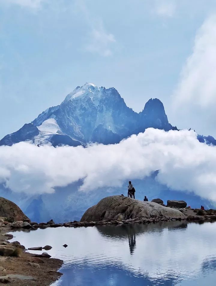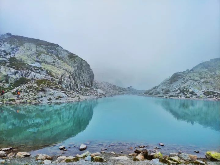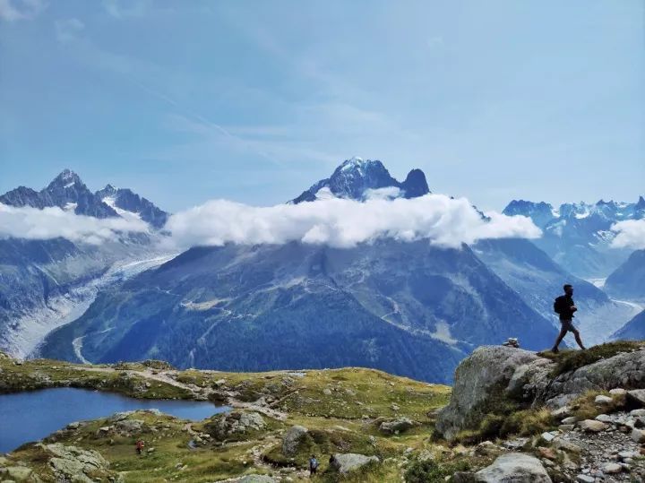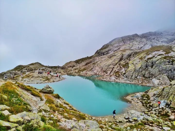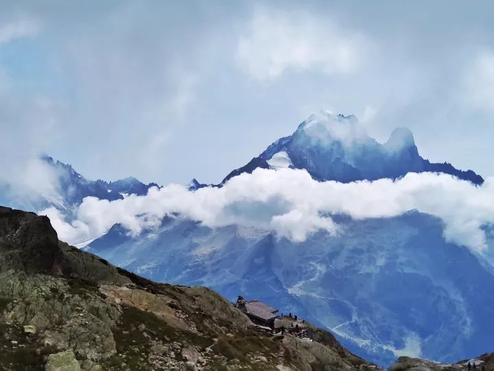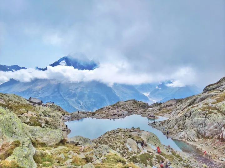 八月的环勃路上,人特别多,多到我都怀疑人生:这是欧洲吗?我怎么感觉像我们的国庆节啊? 中午到了海拔2352米的著名 Lac Blanc 勃朗湖边吃午餐,对面的南针峰、勃朗峰在云雾里面忽隐忽现。仙境一样美。