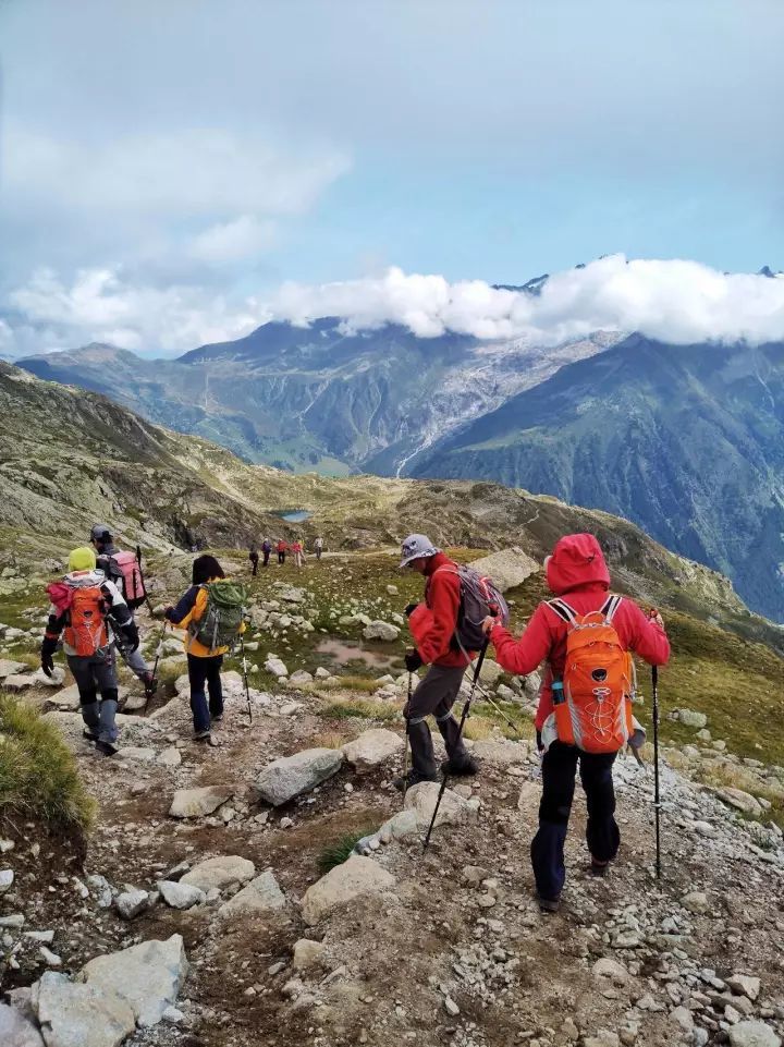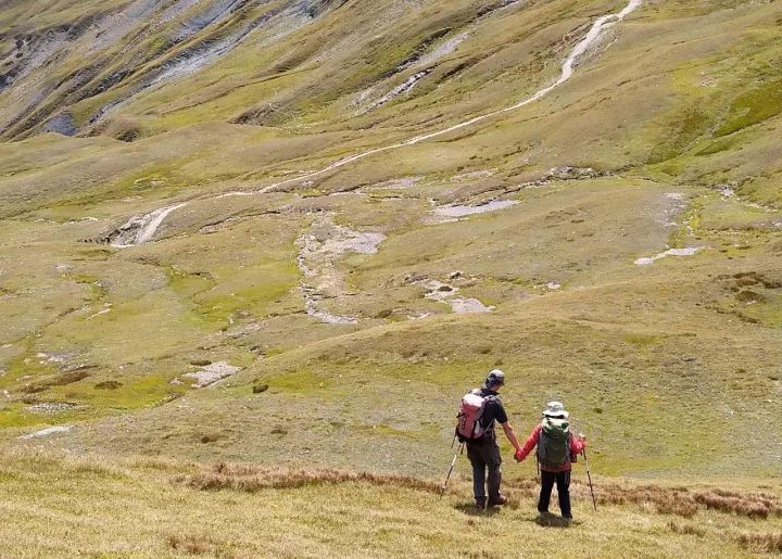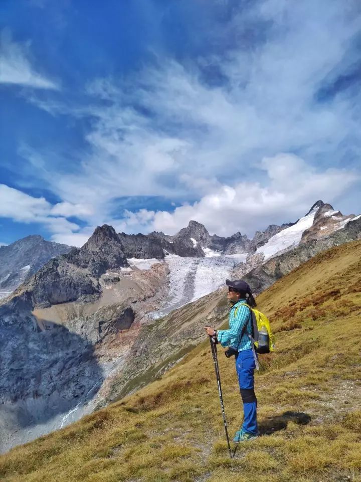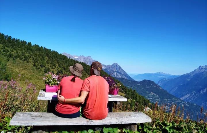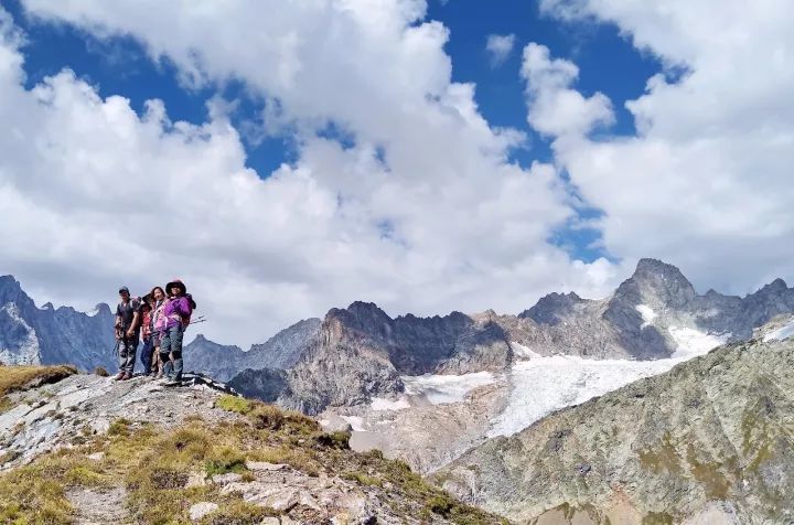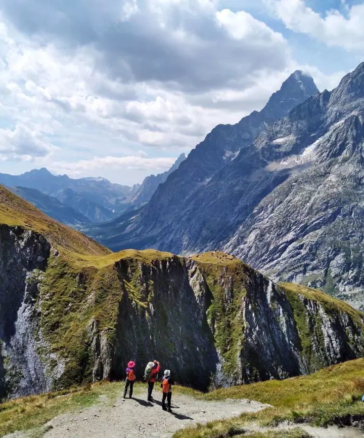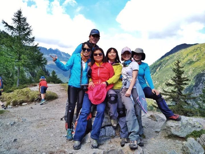 环勃朗峰的路上,遇到的老年人很多,携家带口的也很多。有参加户外公司队伍的,也有自己订了高山木屋自助徒步的,当然也有很多全程负重露营的。有全程徒步的,有走精华路段的,也有一天两天的。世界各地的驴友在路上,相遇时互相打个招呼“Bonjour”,人与人之间迅速拉近距离。