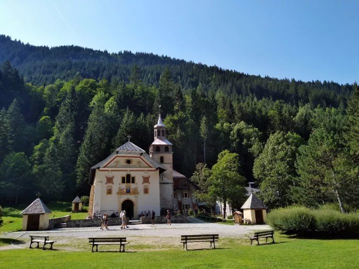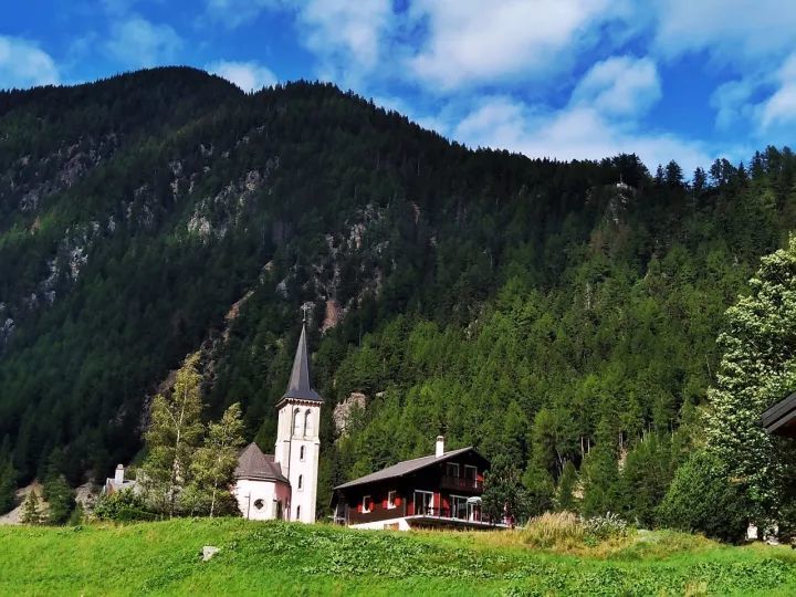 休整后开始翻越海拔2191米的Balme垭口,其实就是滑雪场一路往上。然后开始下坡到达Trient小镇,镇上最显眼的建筑是粉色小教堂。看到它,就知道目的地到了。