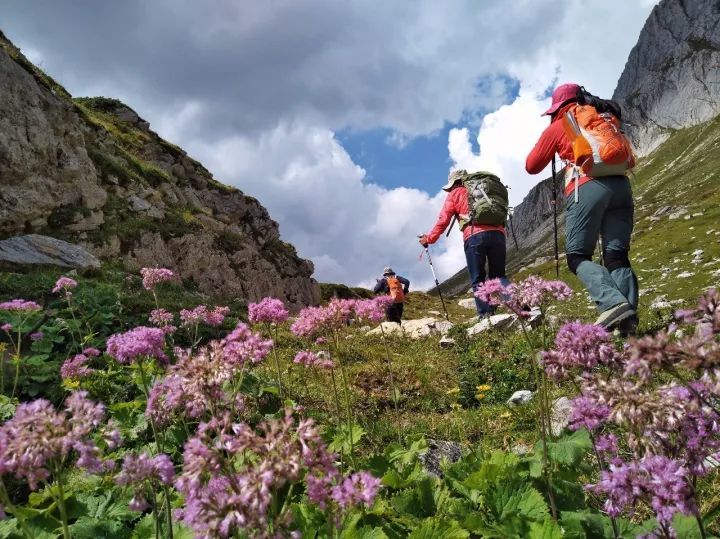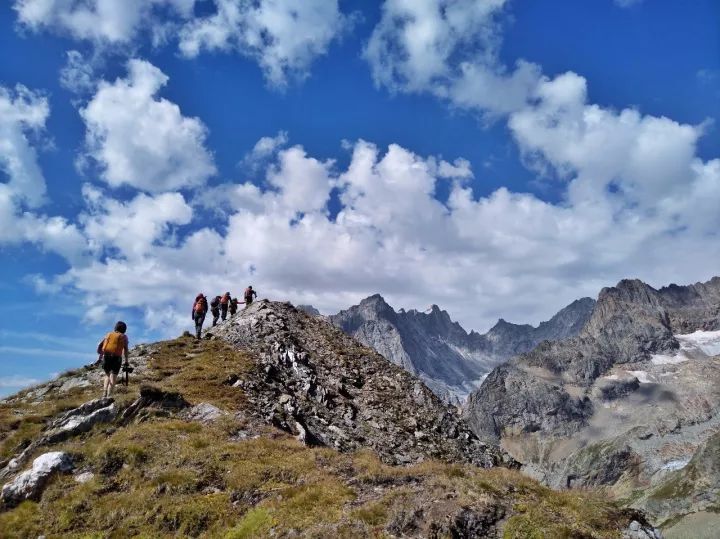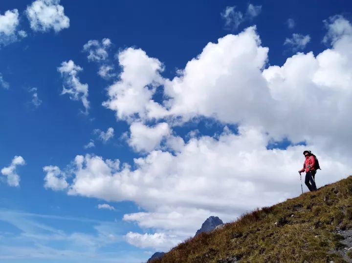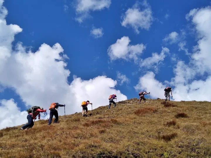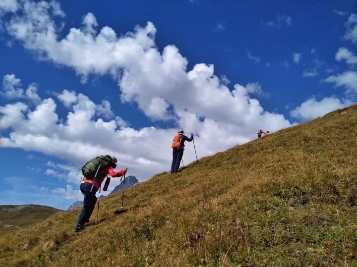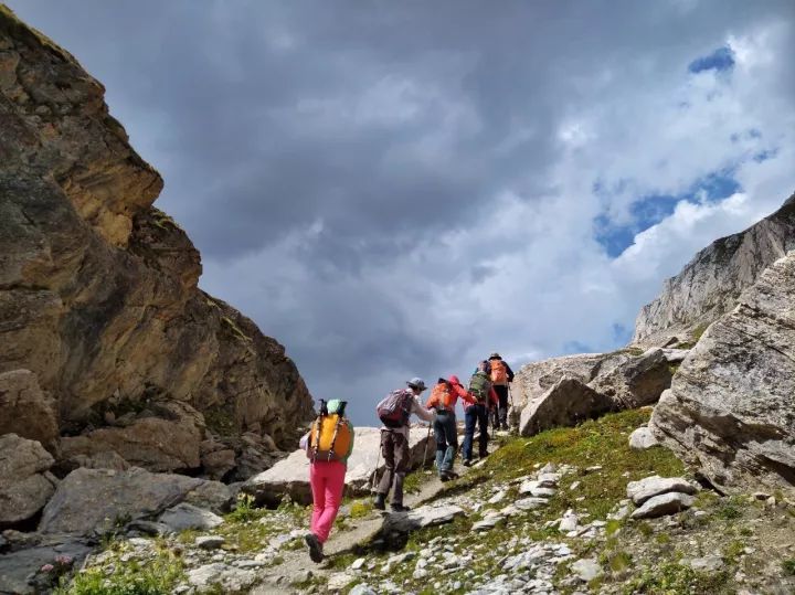 依旧是早上五点就起床,大家收拾好东西,吃过早饭七点就出发。一路慢慢爬升,看土拨鼠玩耍,到达第一个垭口休息。我和蔡蔡就用手机放起了音乐跳起了舞。 一曲完毕,继续往上爬,向导压着速度,此时后队变前队。因为这个速度特别适合慢速同学,快速同学只好在后面玩耍,等前队走了一段之后,再赶上来。徒步节奏不一致,确实需要大家的配合