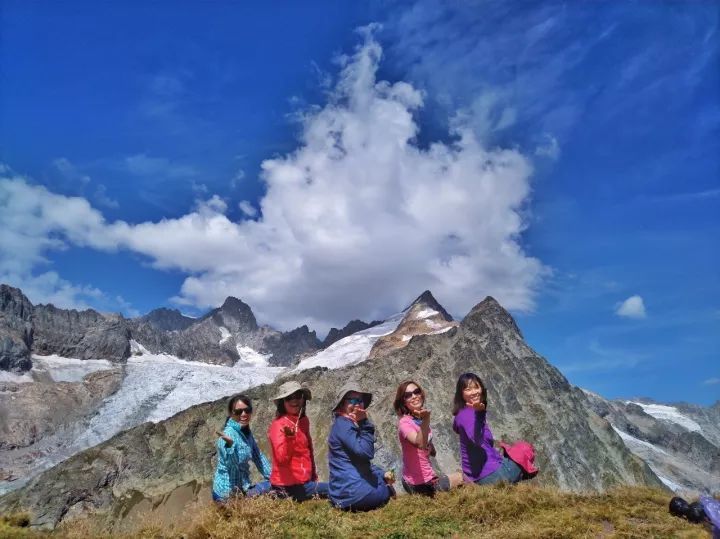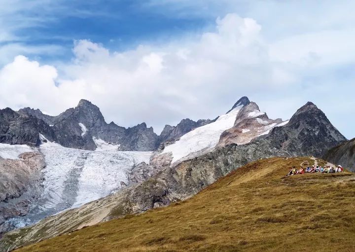 爬高一点,风景就不一样。我们坐在高处,雪山冰川仿佛触手可及。在这里解决完午餐下山,经过垭口,垭口上的人相当多。这一段看来和第一天一样,也是一日徒步的好选择,所以人潮汹涌。