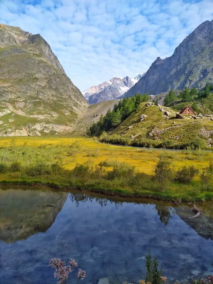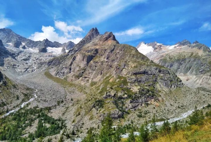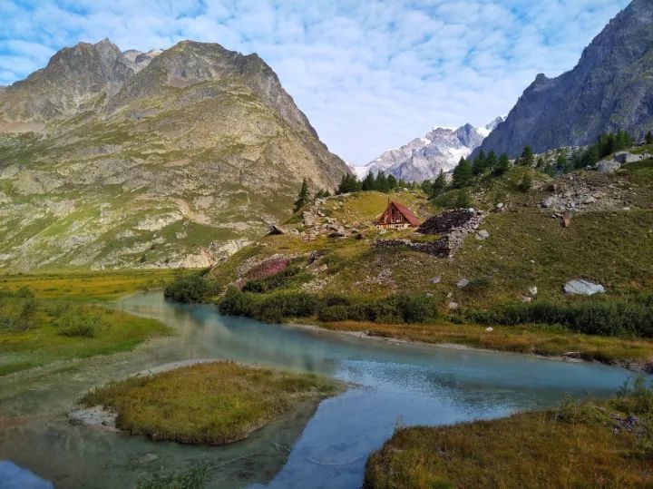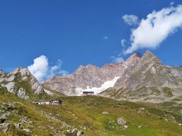 到达湖边,天色又开始慢慢放晴,不消几分钟,云开雾散,我们看到了最迷人的Combal湖和河谷。远远地,向导指了指夹在两条冰川中间的RefugeEllsabetta:咱们上去喝一杯!