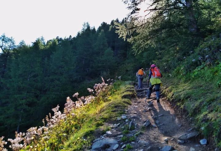 早上八点,从Le Tour吃过早饭开始往上爬,树林里面钻了不久,就进入了草甸地带。一路上Sebstain给大家讲讲阿尔卑斯的植物,拍拍照片,走起来颇为轻松。