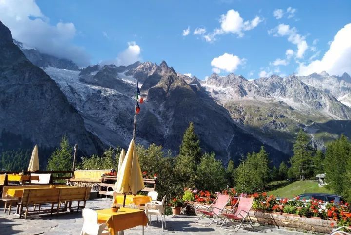 一路边拍边下山,经过海拔2054米的Elena木屋,继续往下到1700多米的Arp Nouva搭车前往Courmayeur。车上一路的景观也超级棒,不过上来一大波学校组织玩耍的熊孩子,整个巴士上吵吵嚷嚷的。全天下的小学生都一样,超过十个人分贝就达到令人脑壳疼的地步。大约四十多分钟后,终于到达库马约尔的汽车站,接着换乘了下一辆继续前行了十多分钟,下车然后沿公路往上又爬升了两百米,到达景观无敌Refugee Mont-Blanc。