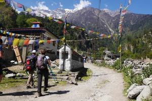 到了Bhratang后,就会看到著名的Paungda Danda Rock,号称:天堂之门。高1000多米的光滑的大岩壁,然后徒步一个小时,到达Lower Pisang。徒步5小时左右。