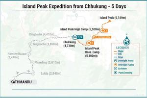 岛峰(Island Peak)攀登的过程,大部分都非常简单,但有些路段依赖技术性,因此需要经验丰富的高山向导。难度要大于附近的梅拉峰 Mera Peak (6476米)。因为后者几乎不需要技术性支持。