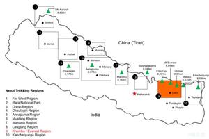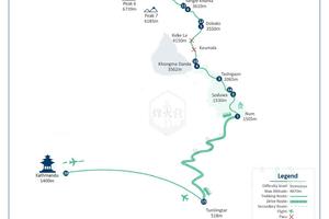 在进入海拔3873米的孔玛拉之前,需要攀登一条被杜鹃花树环绕的小径。在攀登 Khongma La 后,辛苦得到了回报,欣赏了 Makalu 和 Chalang 等壮丽山峰的壮丽景色。短暂下降后,再徒步爬升,沿着山脊行驶,直到到达海拔4055米的Ghungru La(Tutu La)。 海拔4220米的希普顿拉(Shipton La)在徒步穿过一条岩石,仅可上山的路径后即可到达。在通往山口的路上,会发现带有咒语和飘扬的经幡的玛尼墙。