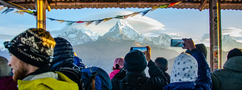 在Poon Hill的西北方,著名的道拉吉里峰(8172米)引领周围的群峰一字排开。两个地点的相对方向正好特别适合观看雪山的日出。在PoonHill的东北侧则是有7000米以上的Baraha Shikhar(7647米)、安娜普尔纳南峰,以及神山鱼尾峰(海拔6,993米)。在Poon Hill观看的雪峰,可以说是180度的,一字排开,非常宏伟。在晨曦的照射下散发着圣洁的光芒。